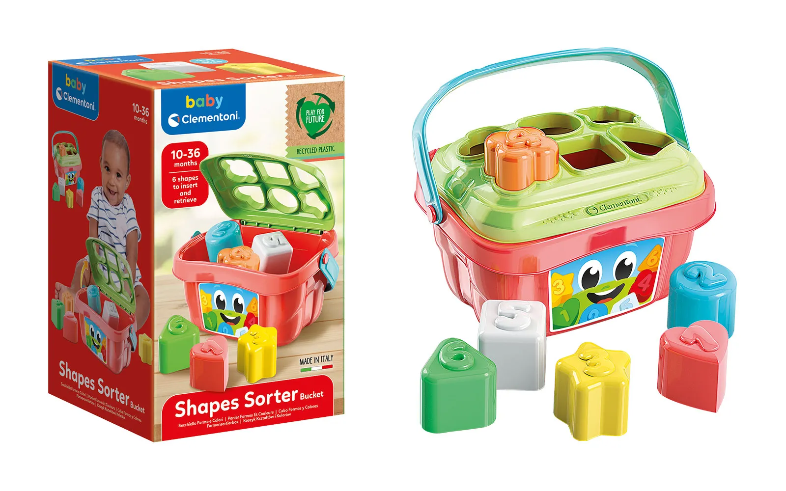 Vedro s pokrovom in ročajem ter 6 liki različnih barv in oblik za otroke stare od 9 do 36 mesecev. Šest likov različnih barv v obliki valja, trikotnika, kvadrata, rože, zvezde in srca, ki jih lahhko vstavite v pokrov vedra. Zabavna igra spoznavanja oblik in barv za najmlajše.