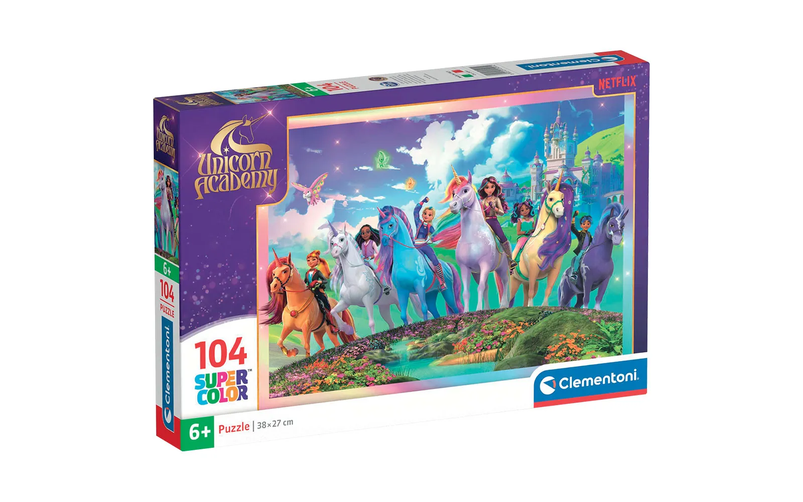 Sestavljanke različnih risanih junakov s 104 sestavnimi deli so primerne za otroke od 5./6. leta starosti dalje. Sestavljanke supercolor Clementoni spremljajo otroka v vseh fazah razvoja in mu pomagajo razvijati ročne spretnosti ter sposobnosti opazovanja. Kakovost materialov in posebna tehnika tiskanja zagotavljata vedno lepe, žive in jasne barve. Na voljo v motivu Unicorn academy.