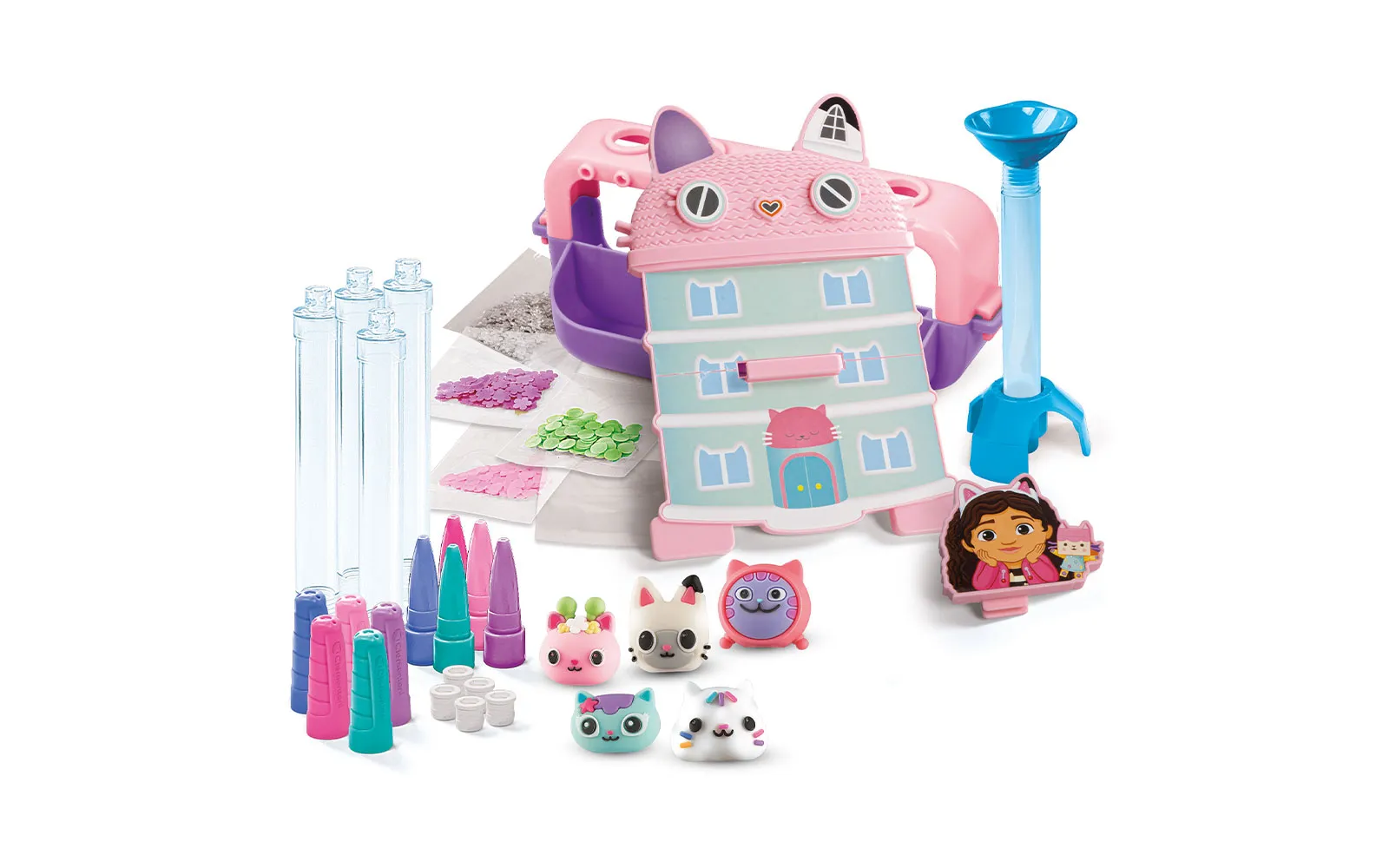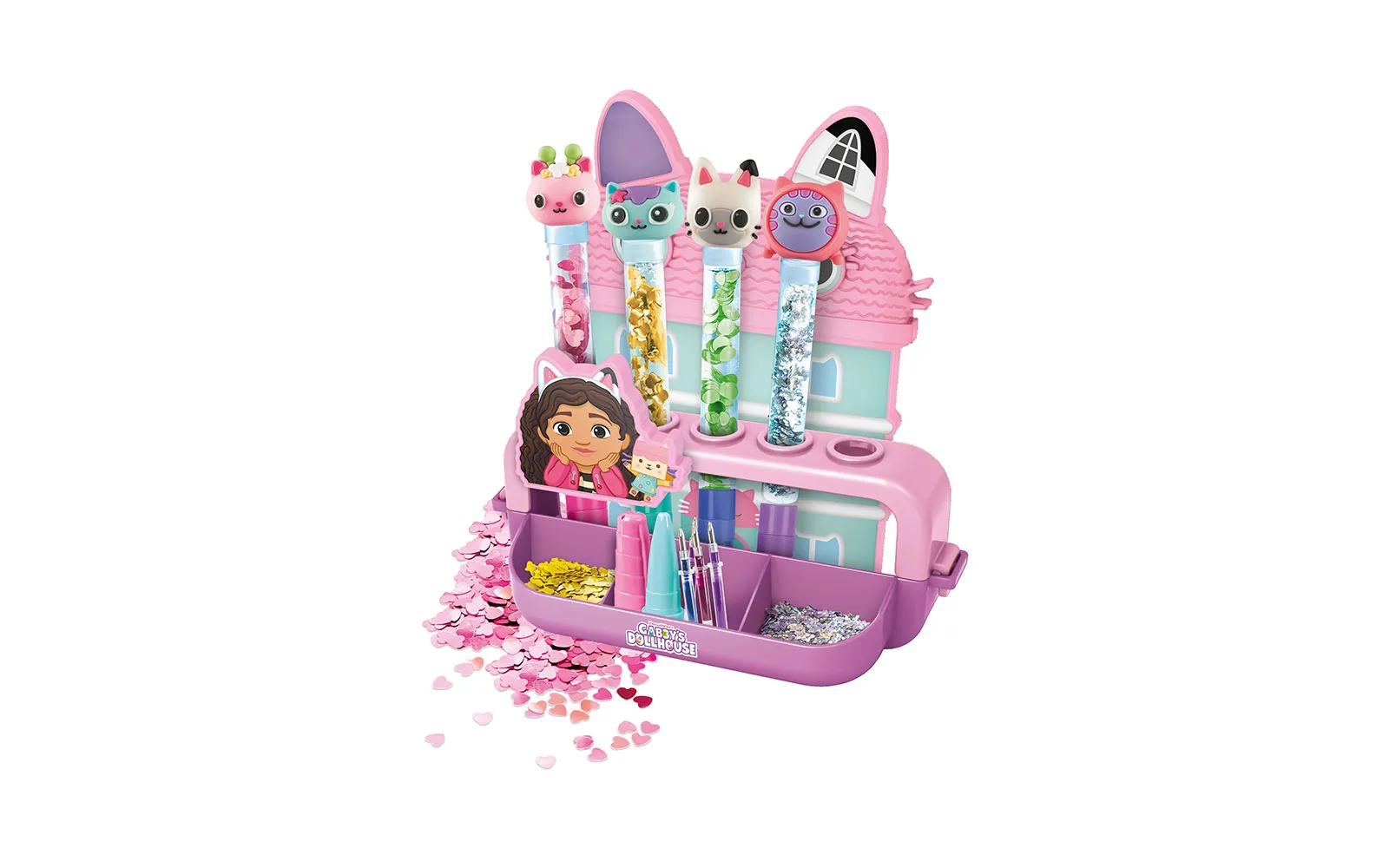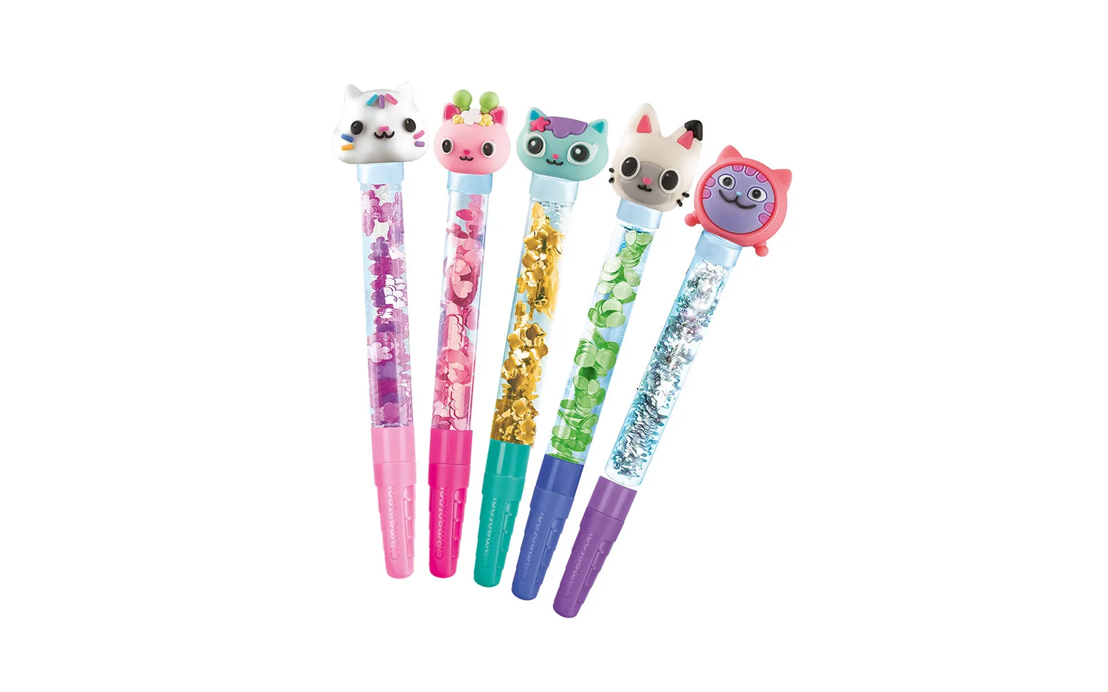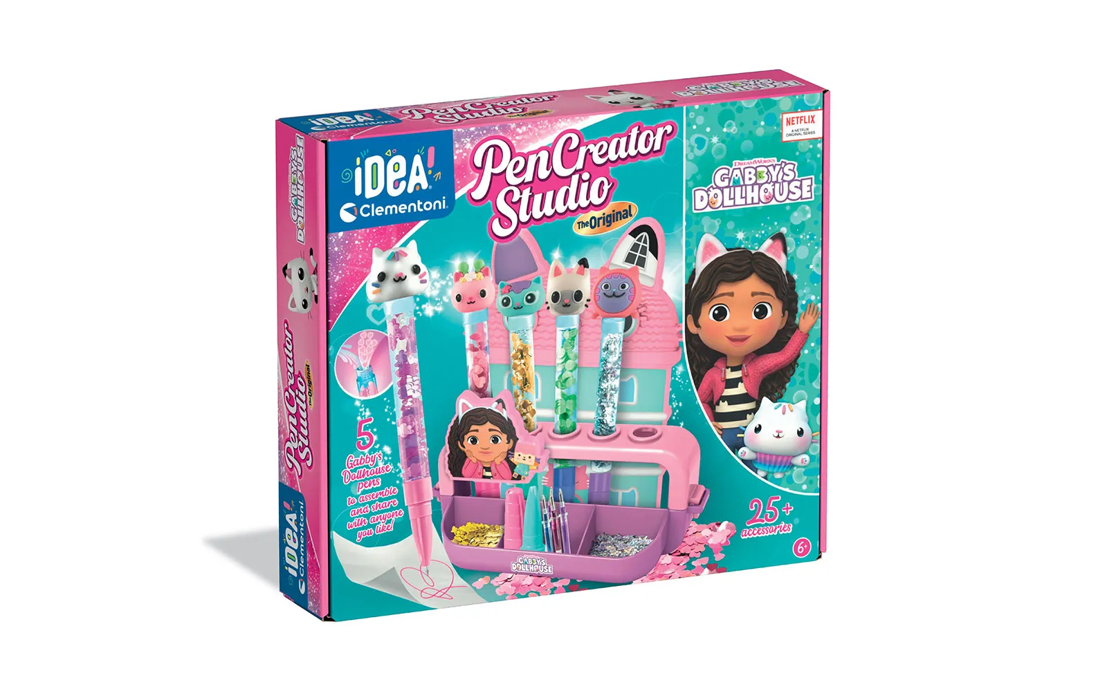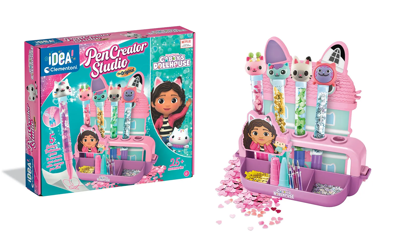 Ustvari čudovita in unikatna pisala s čisto novim Pen Studiem - Gabby's dollhouse! Popoln komplet za ustvarjanje pisal v pravljičnem slogu Gabby in njenih prikupnih muck. Set vsebuje plastično stojalo in lij, 5 prozornih ohišij za pisala, 5 belih čepkov ter 5 pokrovčkov s konicami v ujemajočih se barvah, 5 vložkov s črnilom v različnih barvah, 5 vrečk mavričnih okraskov različnih oblik in barv, 5 gumijastih likov, nalepke Gabby’s Dollhouse ter ilustrirana navodila.