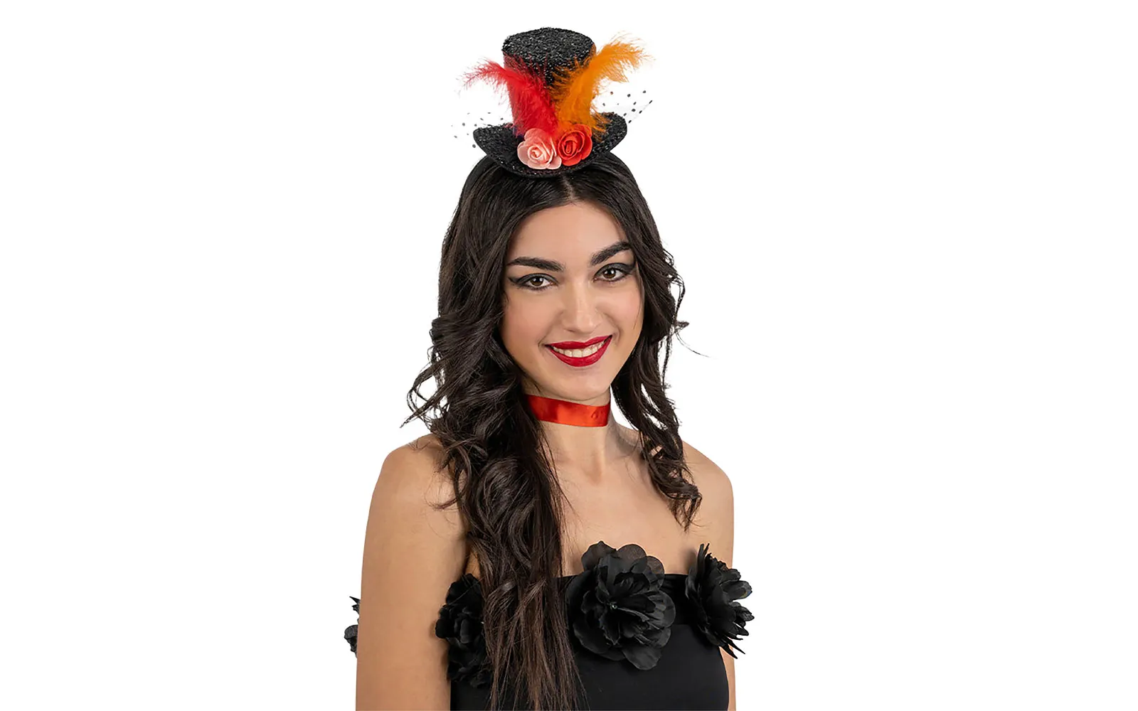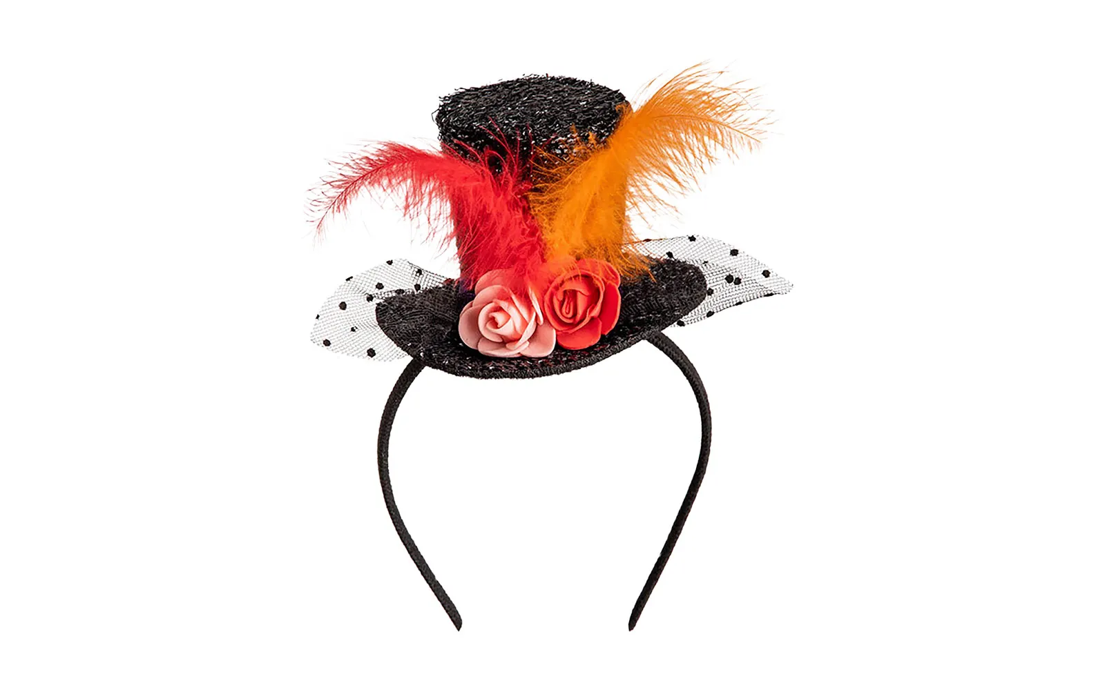 Pustni obroč s klobučkom, rožicami in perjem, črne barve, Carnival Toys. Za popestritev pustnega kostumčka si nadeni očarljiv klobuček in poskrbi za pravo pustno preobrazbo.