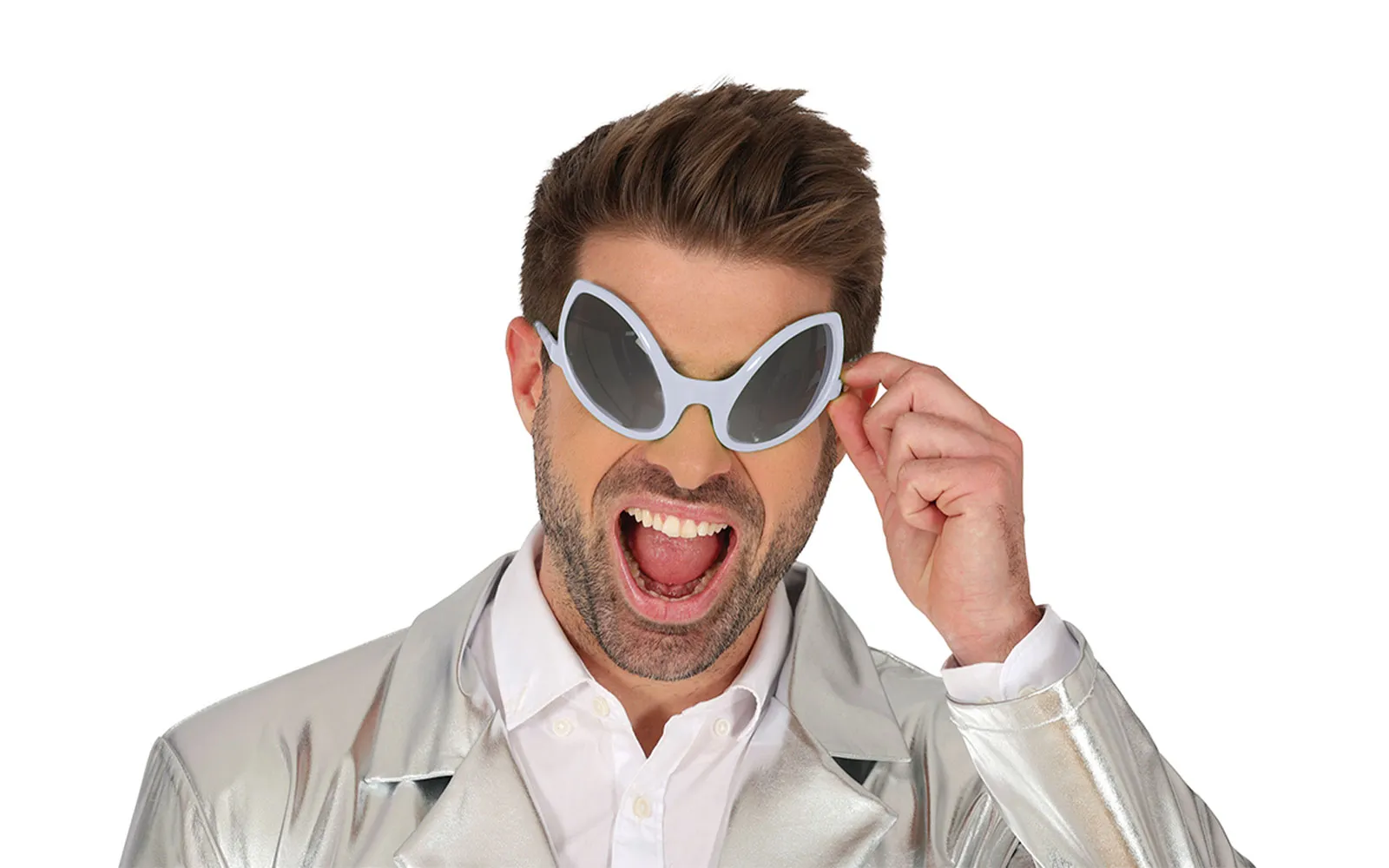 Pustna očala Alien, sive barve. Očala Alien so zabaven in izrazit modni dodatek, idealen za pustne norčije, rojstnodnevne zabave ali tematske dogodke. S svojim posebnim okvirjem in obliko pritegnejo pozornost in poskrbijo za veliko smeha ter z njimi lahko izgledate kot pravi nezemljan.