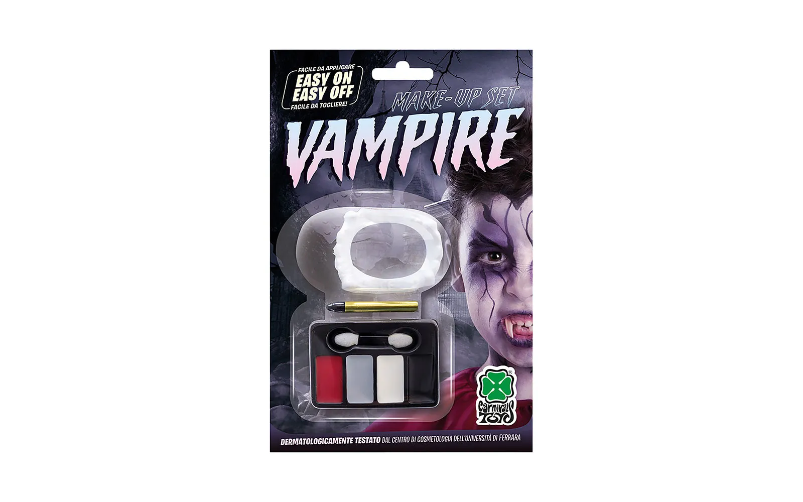 Komplet barv za obraz za vampirja in dodatkom - zobje je idealna izbira za pustne zabave, kostume in strašljive preobleke. Barve so varne, enostavne za nanos in trajne, da bo tvoj vampirski videz ostal brezhiben vse večerno rajanje.