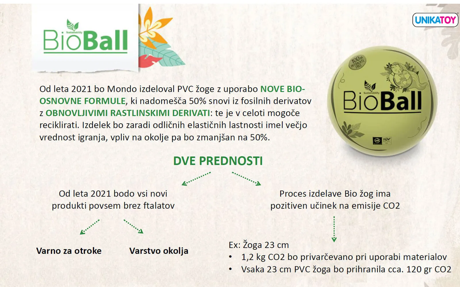 Otroška bio žoga FI 230mm z motivom Pujse Pepe. Žoga je izdelana po okolju prijazni formuli, ki nadomesča 50% fosilnih derivatov z obnovljivimi rastlinskimi derivati. Novi material je neprimerno prijaznejši za okolje in omogoča boljše recikliranje in ponovno proizvajanje igrač.