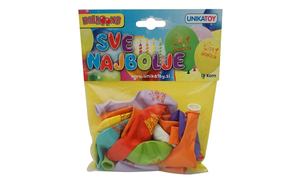 Popestrite si rojstnodnevno zabavo s pisanimi baloni z napisom "sve najbolje". V vrečki je 15 balonov različnih barv.
