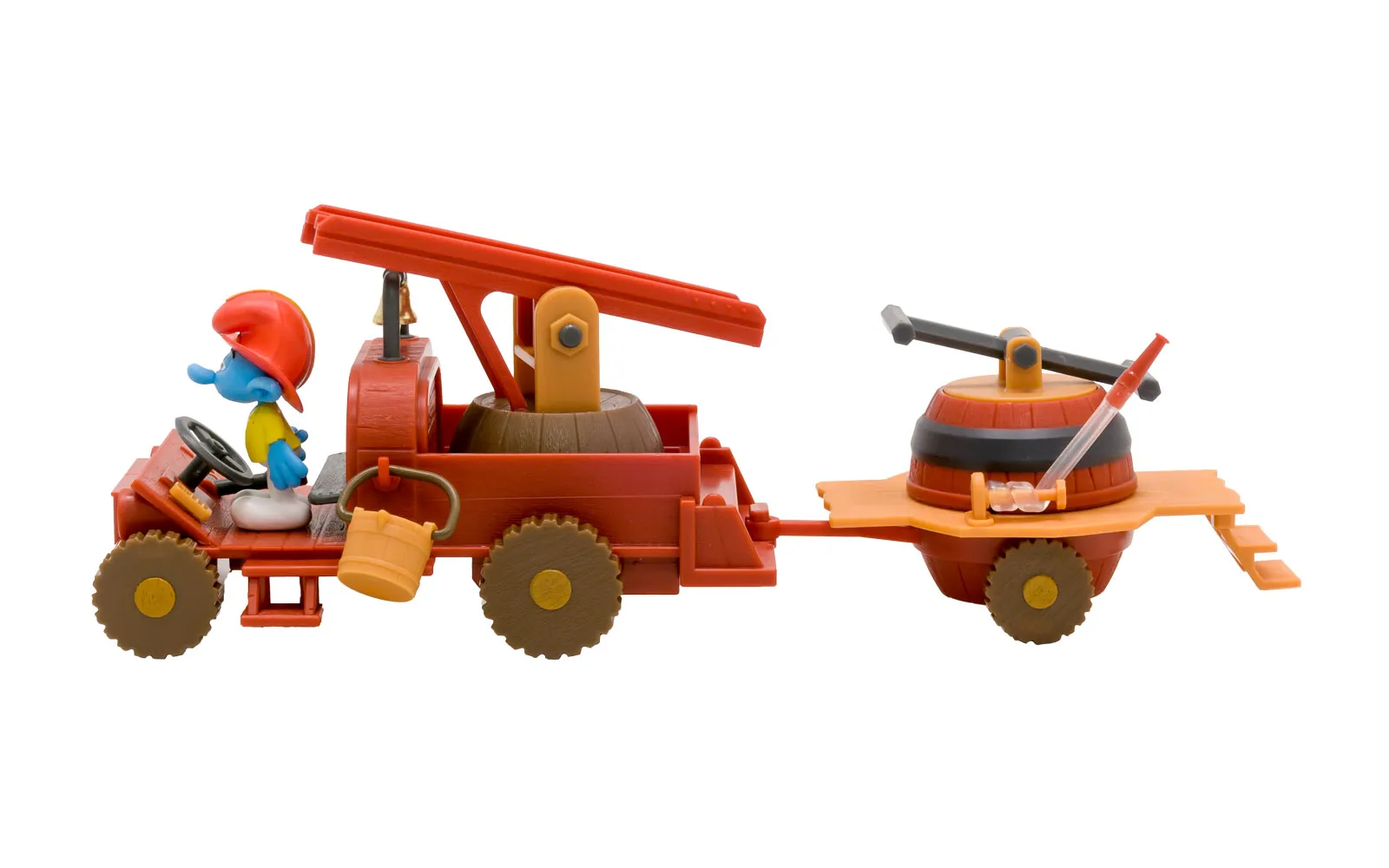 Gasilsko vozilo, set, Smrkci. Vozilo je kot nalašč za priskočiti na pomoč ob večjih požarih! Vozilo ima krmilo in različne dodatke, v setu pa se nahaja tudi 5,5 cm velika figurica junakca Smrkcev.