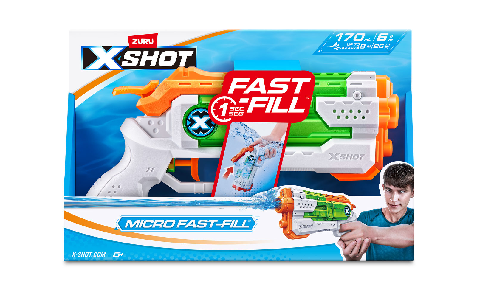 Vodna pištola Micro Fast Fill, X-Shot, priznane blagovne znamke Zuru. Vodna pištola je dolga 25 centimetrov s kapaciteto 170ml, polnjenje pa je enostavno in zabavno - odpri pokrovček, potopi jo v vodo, zapri pokrovček in že si pripravljen za vodno zabavo - vse to le v eni sekundi! Vodni curki imajo doseg kar do 8 m!