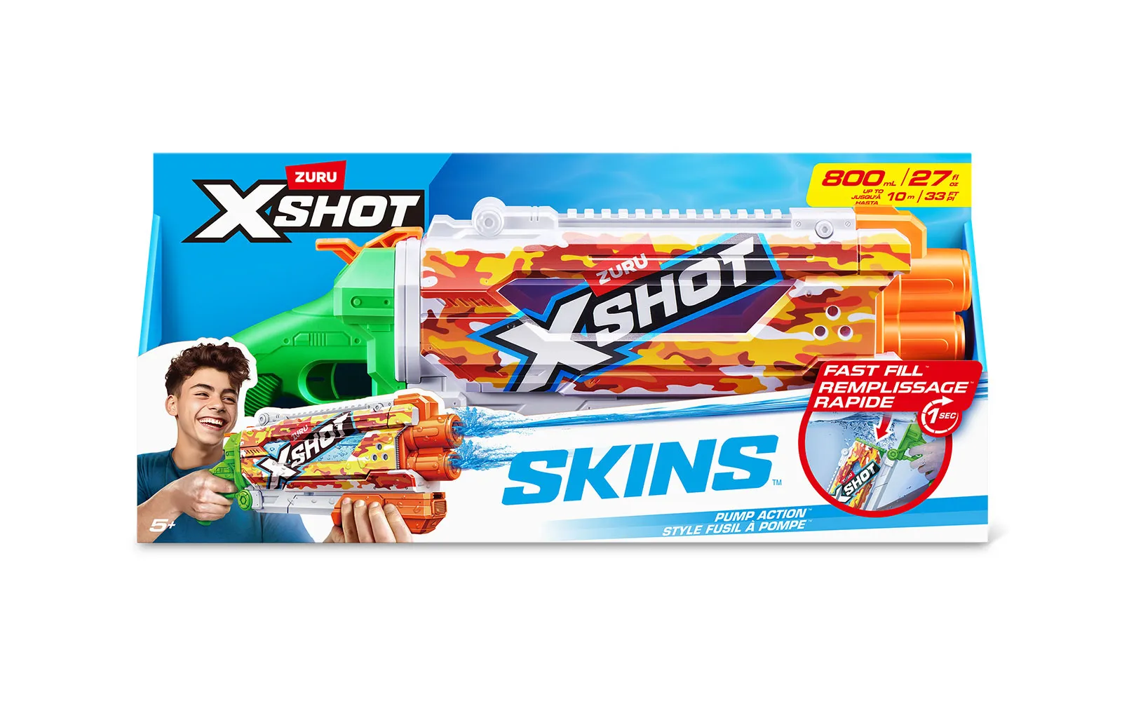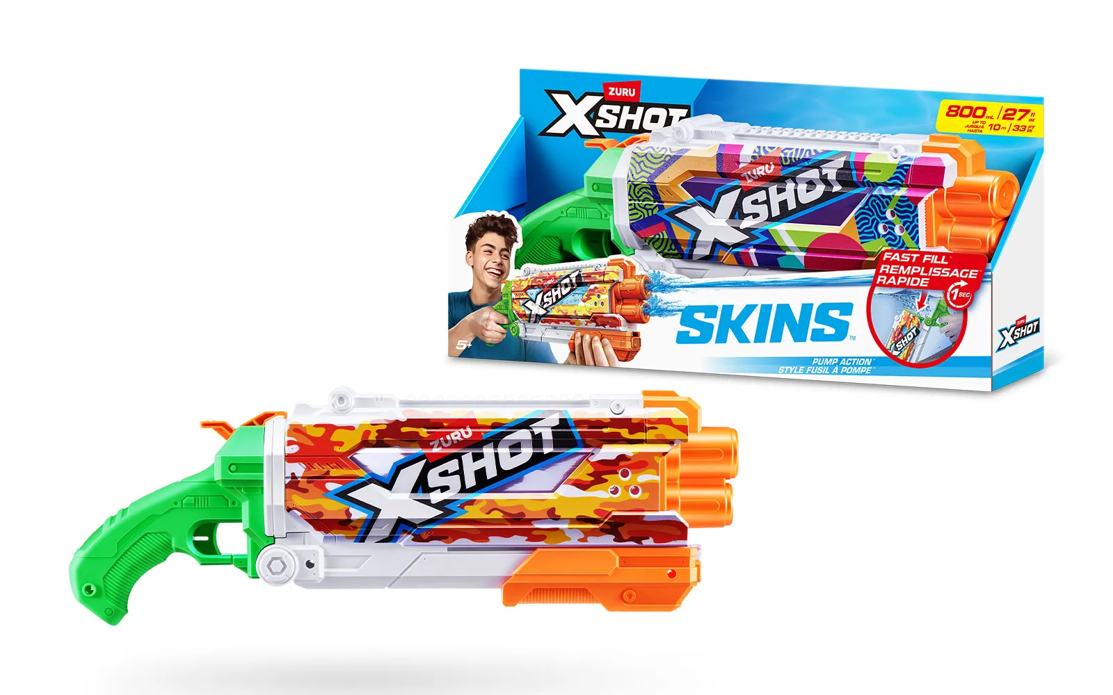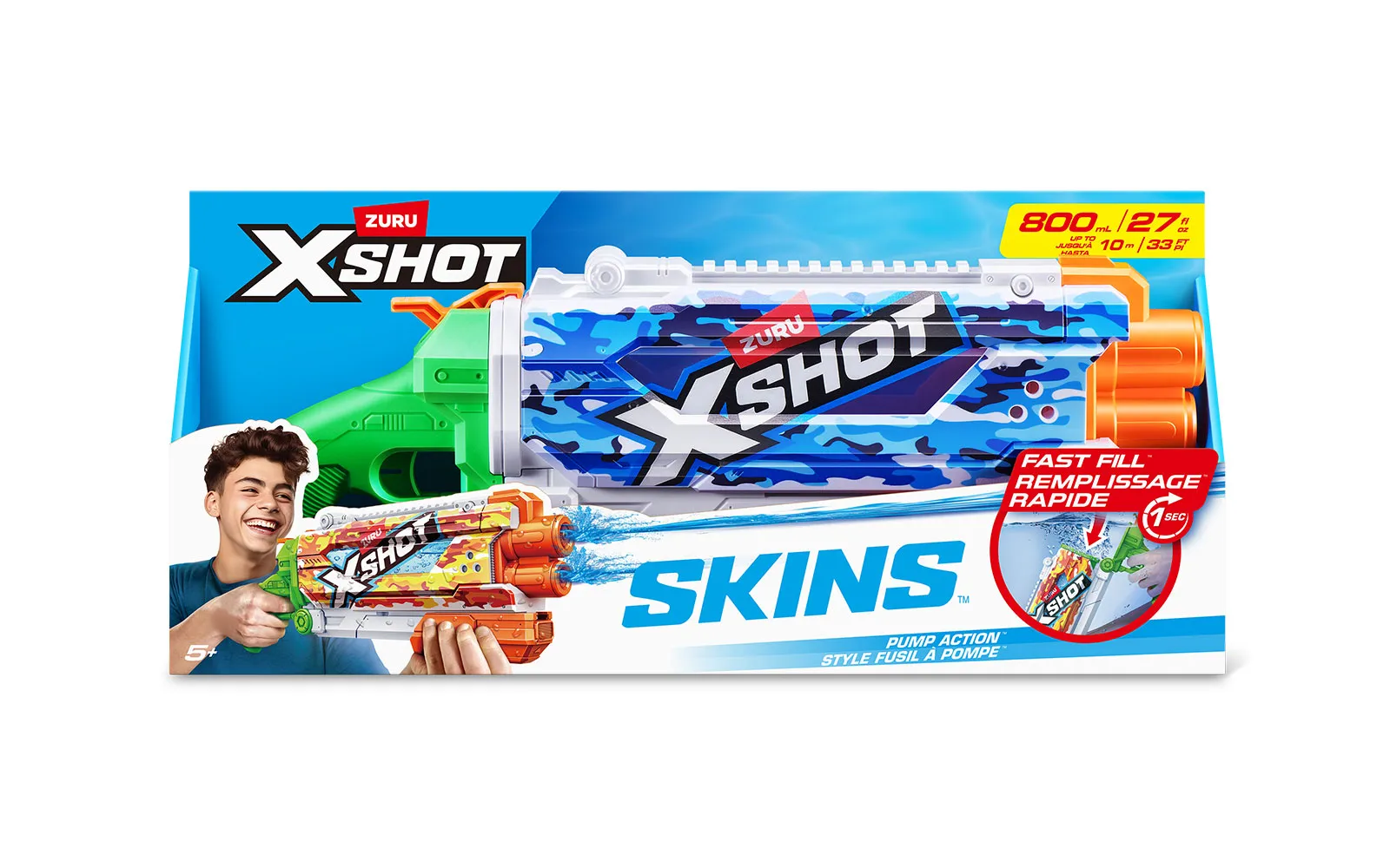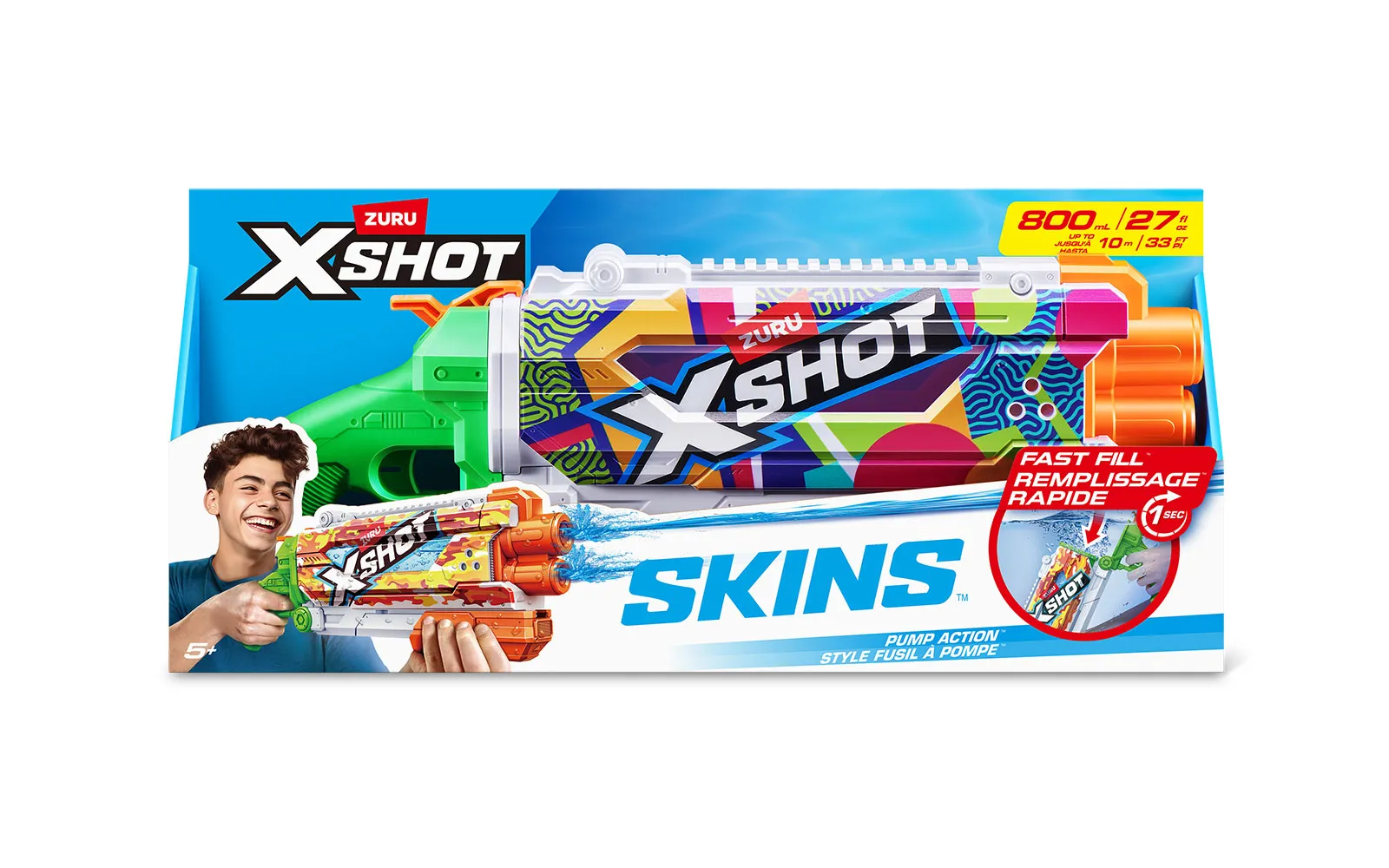 Vodna puška Pump Skins Fast Fill, X-Shot, priznane blagovne znamke Zuru. Vodna puška je dolga 50 centimetrov s kapaciteto 800 ml, polnjenje pa je enostavno in zabavno - odpri pokrovček, potopi jo v vodo, zapri pokrovček in že si pripravljen za vodno zabavo - vse to le v eni sekundi! Vodni curki imajo doseg kar do 9 m! Na voljo v treh različnih stilih.