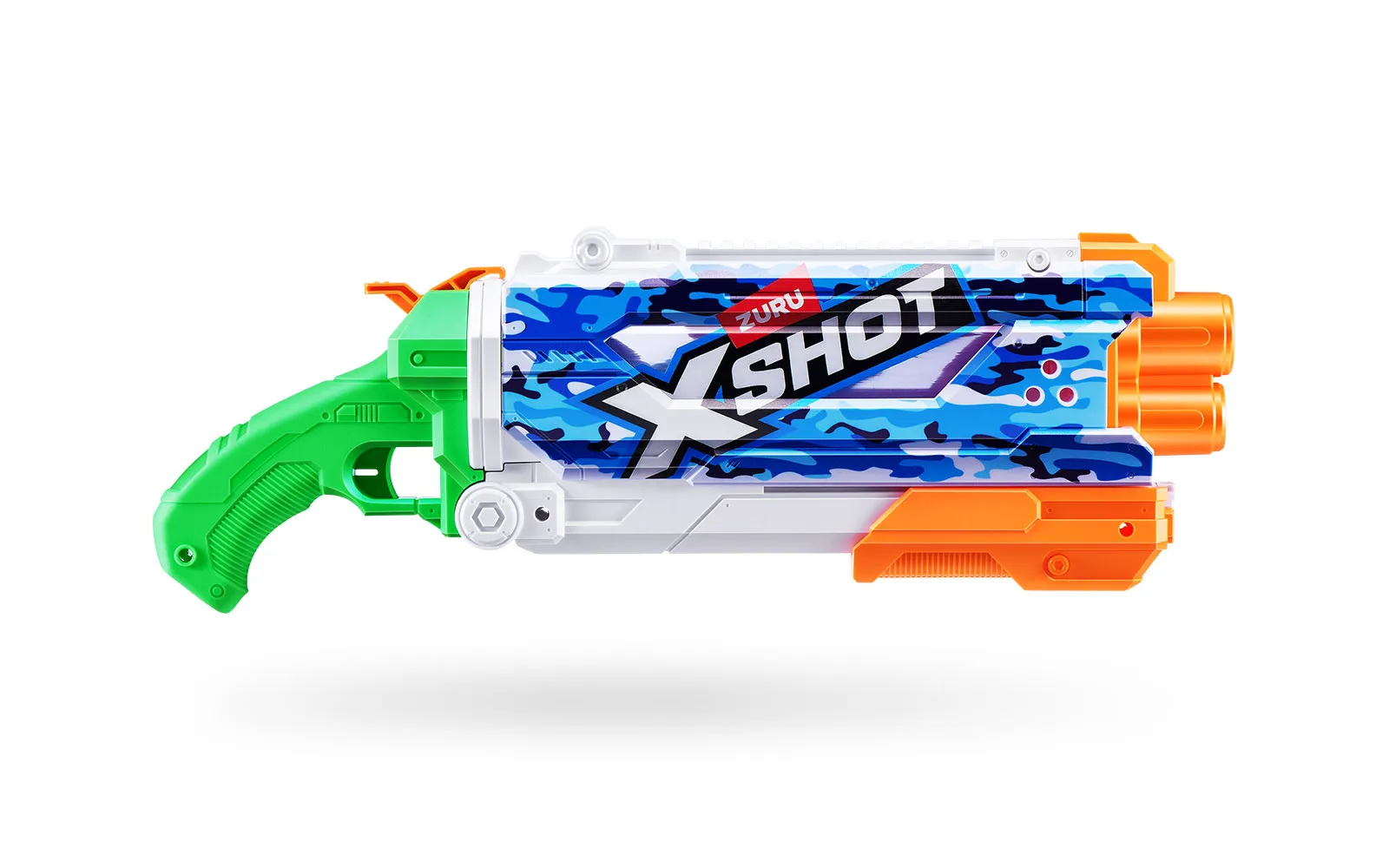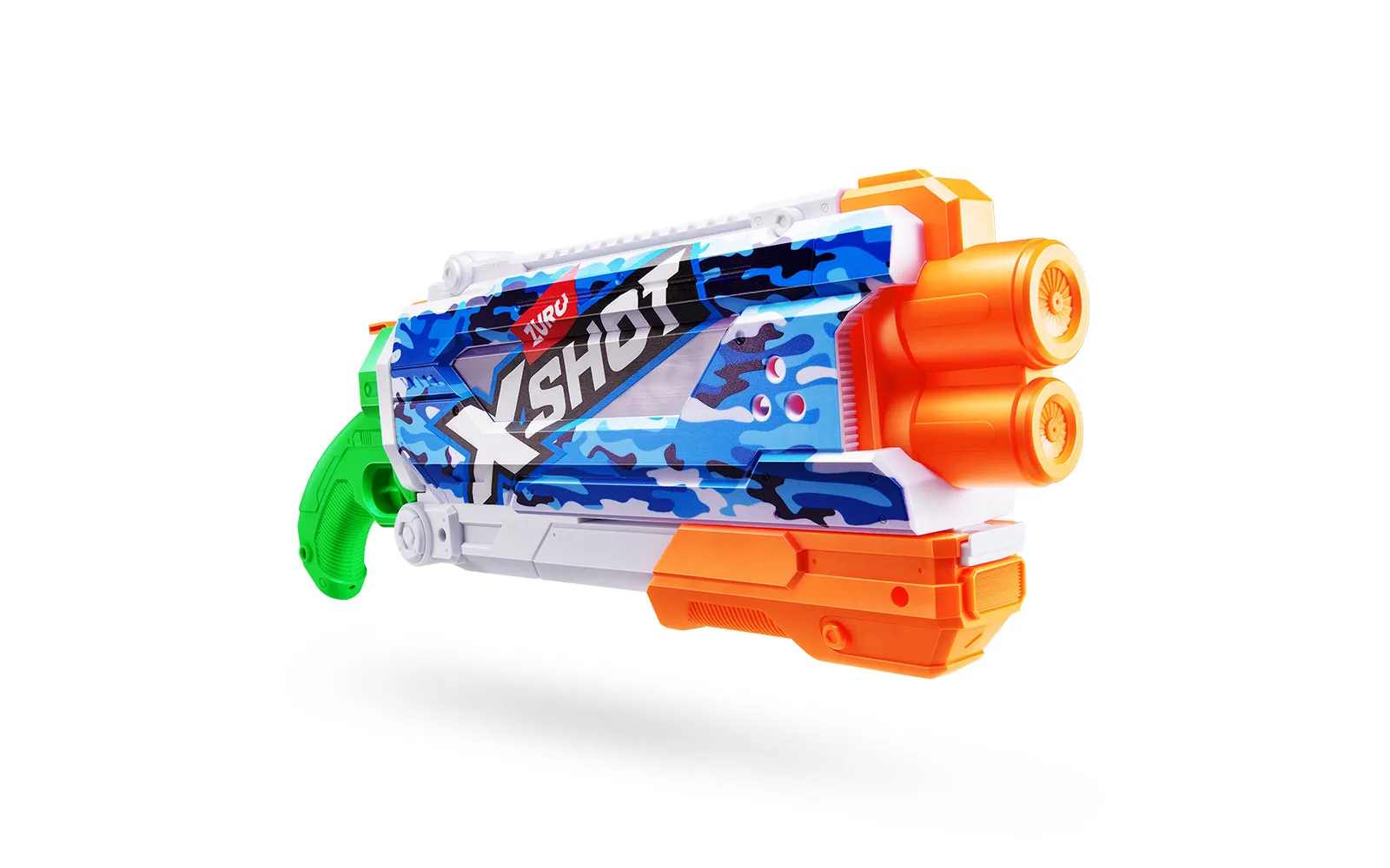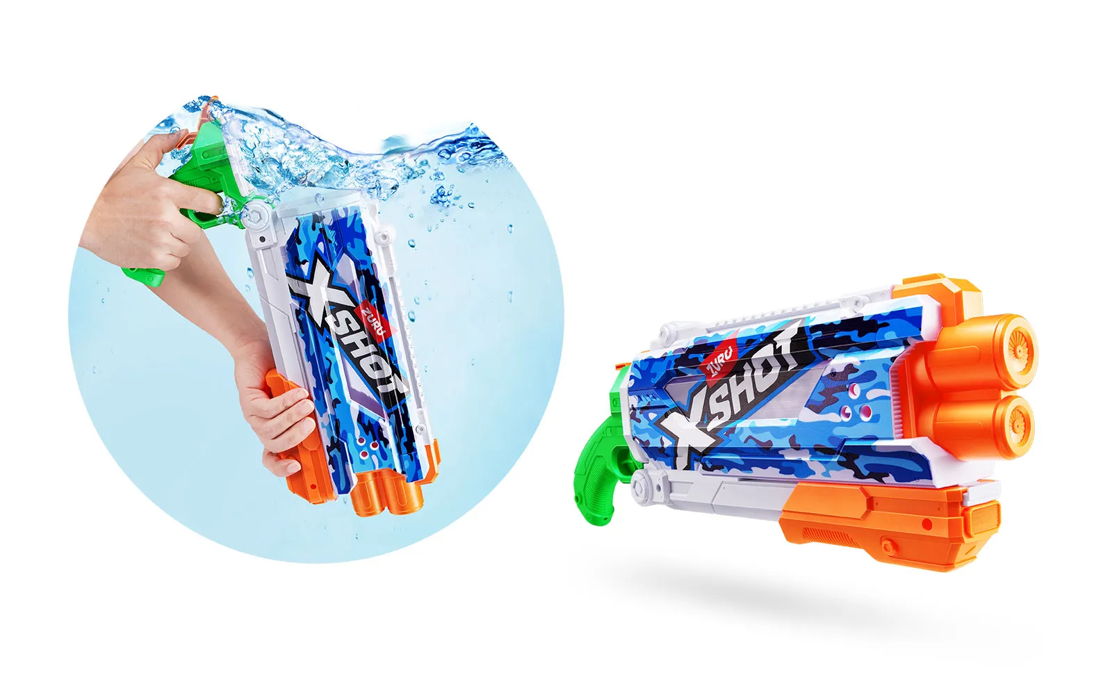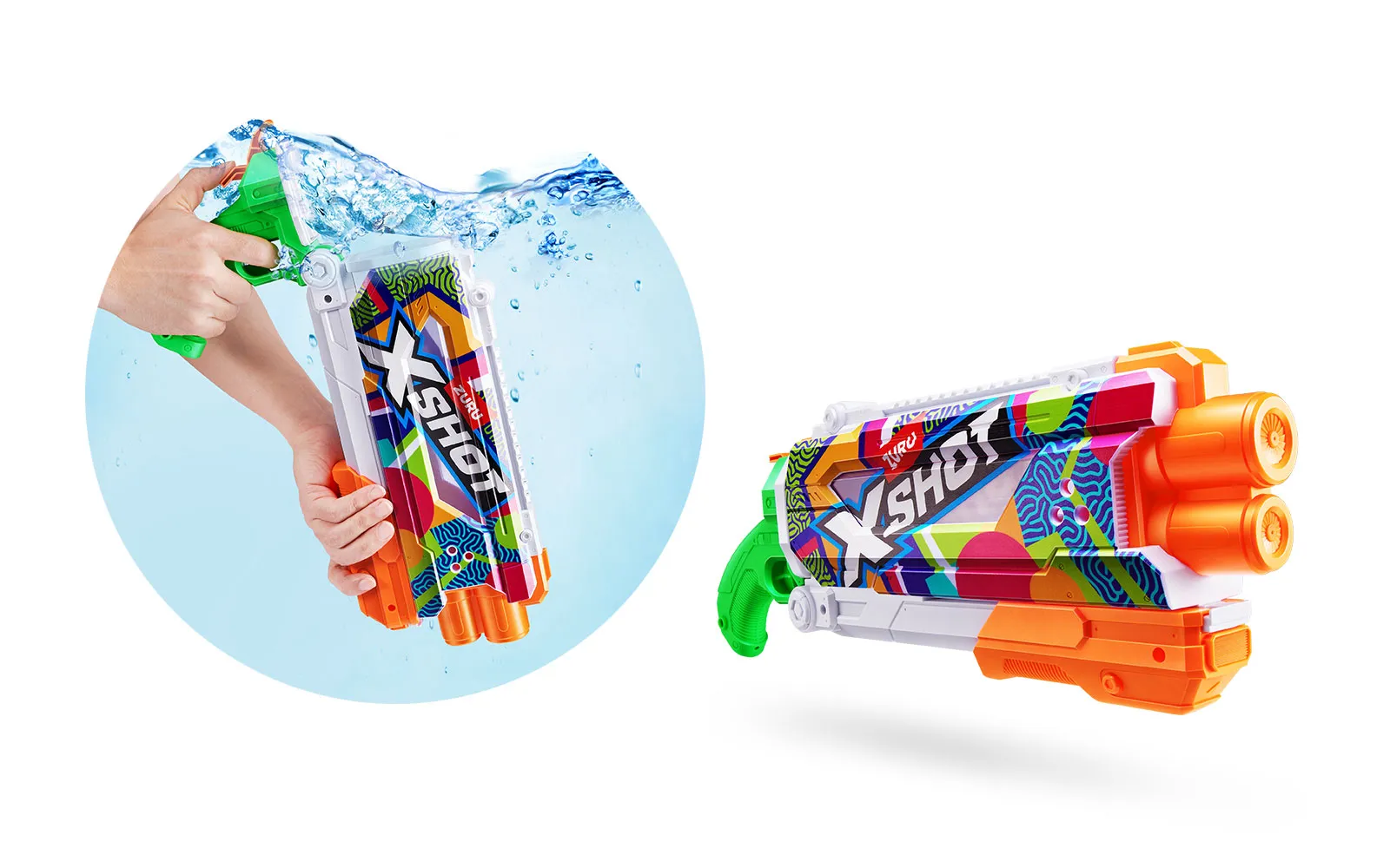 Vodna puška Pump Skins Fast Fill, X-Shot, priznane blagovne znamke Zuru. Vodna puška je dolga 50 centimetrov s kapaciteto 800 ml, polnjenje pa je enostavno in zabavno - odpri pokrovček, potopi jo v vodo, zapri pokrovček in že si pripravljen za vodno zabavo - vse to le v eni sekundi! Vodni curki imajo doseg kar do 9 m! Na voljo v treh različnih stilih.