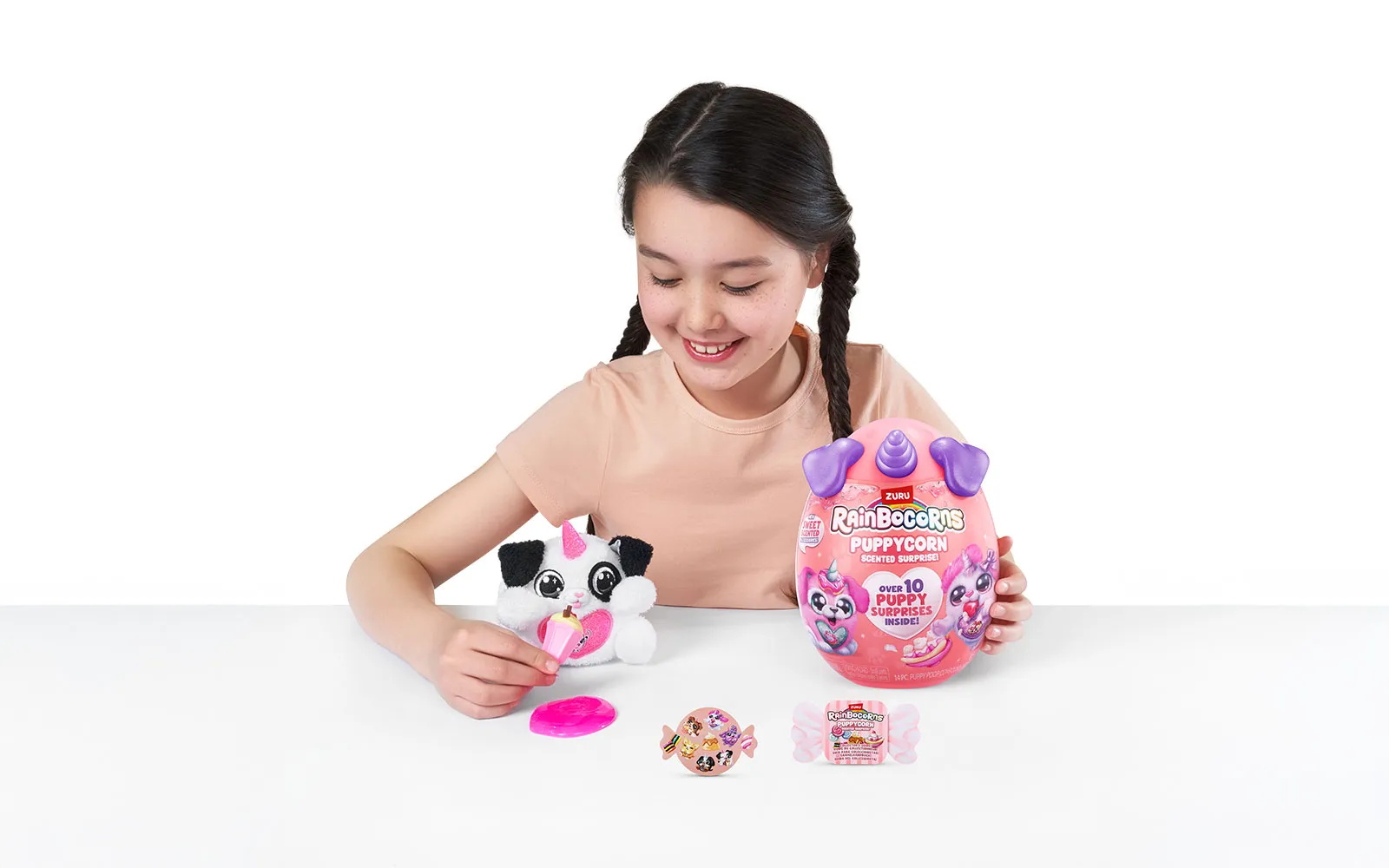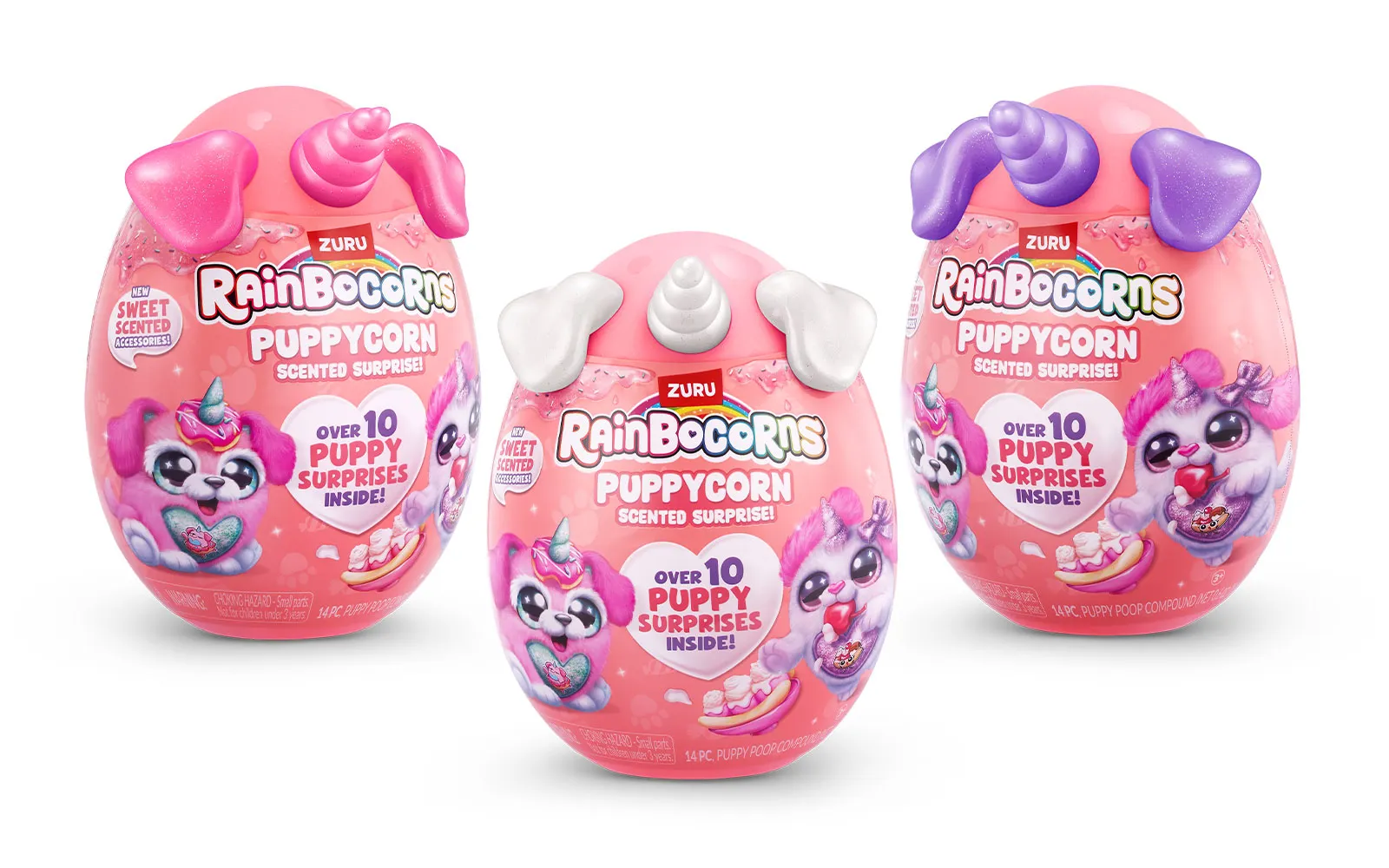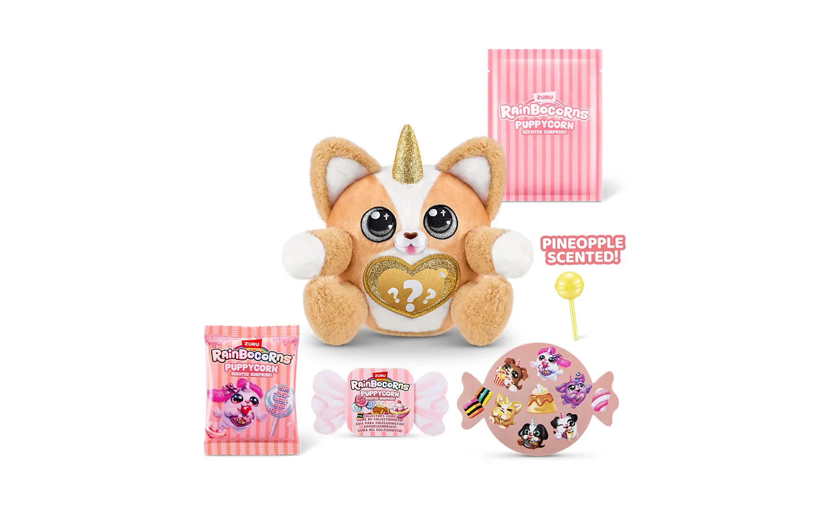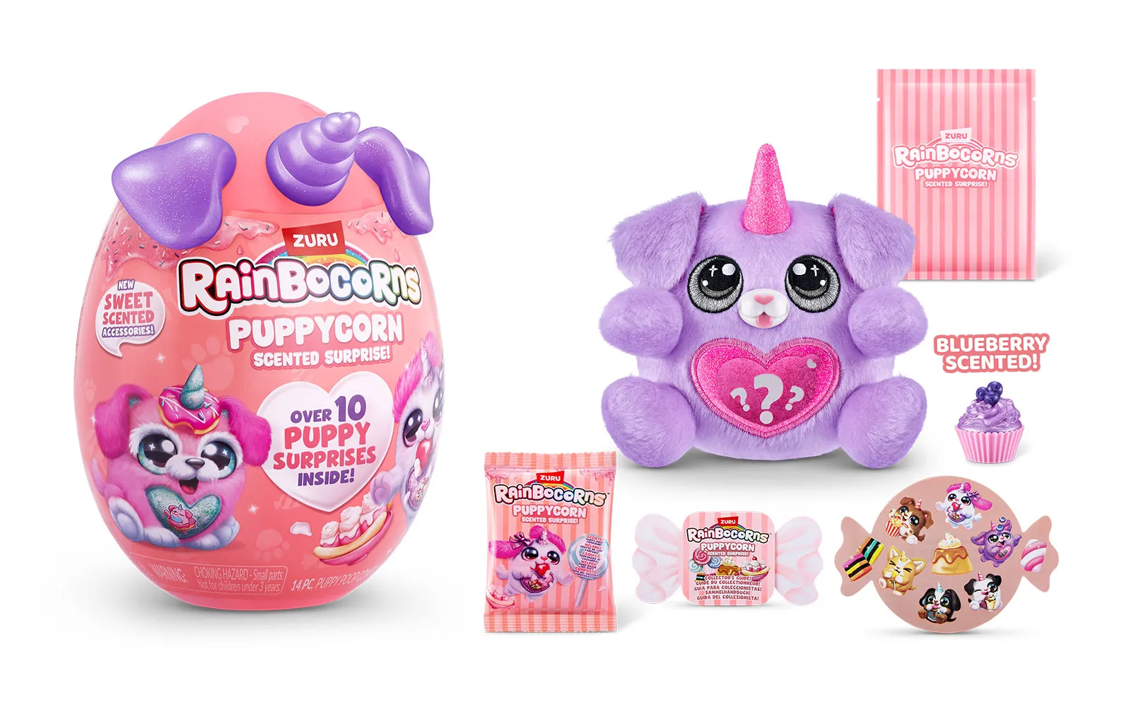 Set vsebuje 1x jajce presenečenja Puppycorn Surprise Egg, 1x Puppycorn plišasto živalico s Peel ‘n’ Reveal Magic Heart srčkom na trebuščku živalice, pod katerim se skriva podobica, 1x dišeči dodatek,9x Puppycorn nalepke, 1x Magic Puppy Poop, vodnik za zbiratelje. Na voljo je 7 različnih puhastih ljubljenčkov. Vsebina artikla je naključna in popolnoma neodvisna od različnih detajlov na embalažah.