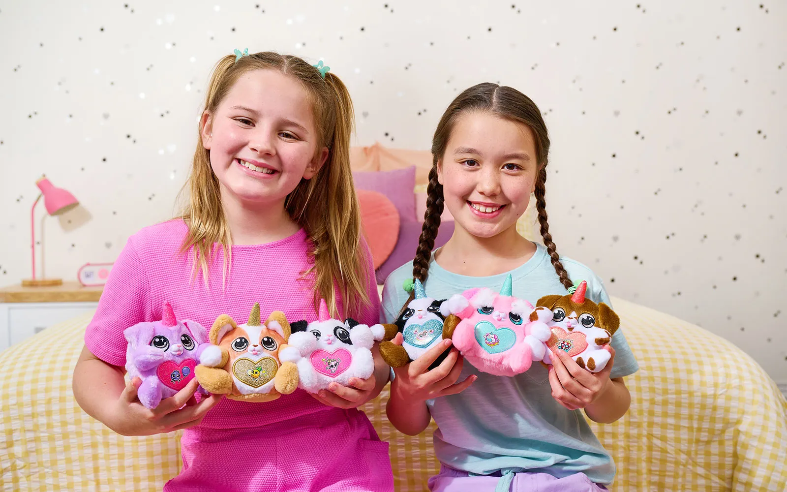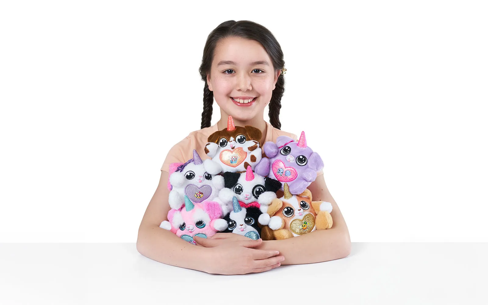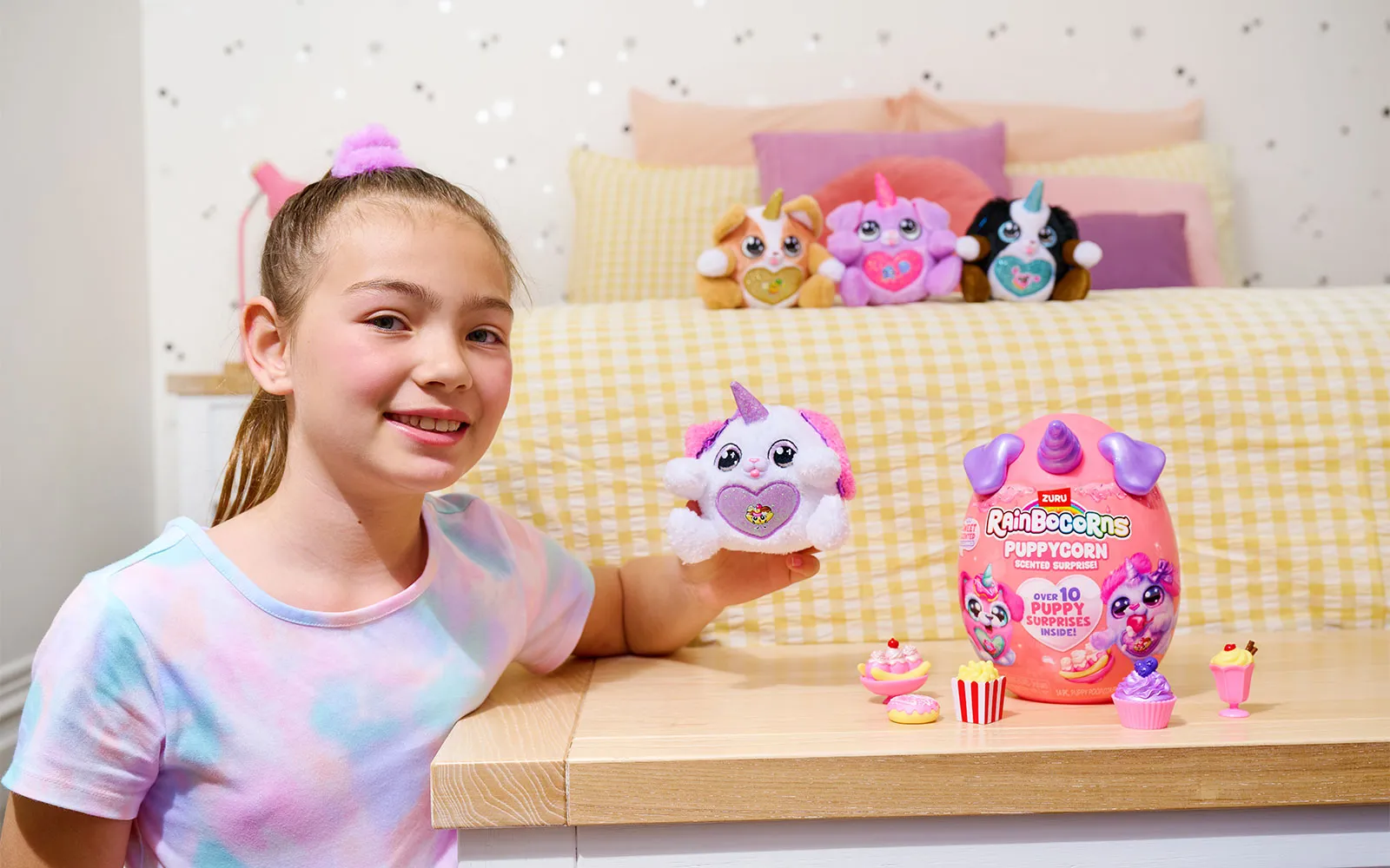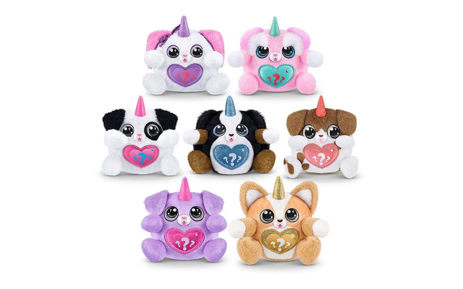 Set vsebuje 1x jajce presenečenja Puppycorn Surprise Egg, 1x Puppycorn plišasto živalico s Peel ‘n’ Reveal Magic Heart srčkom na trebuščku živalice, pod katerim se skriva podobica, 1x dišeči dodatek,9x Puppycorn nalepke, 1x Magic Puppy Poop, vodnik za zbiratelje. Na voljo je 7 različnih puhastih ljubljenčkov. Vsebina artikla je naključna in popolnoma neodvisna od različnih detajlov na embalažah.