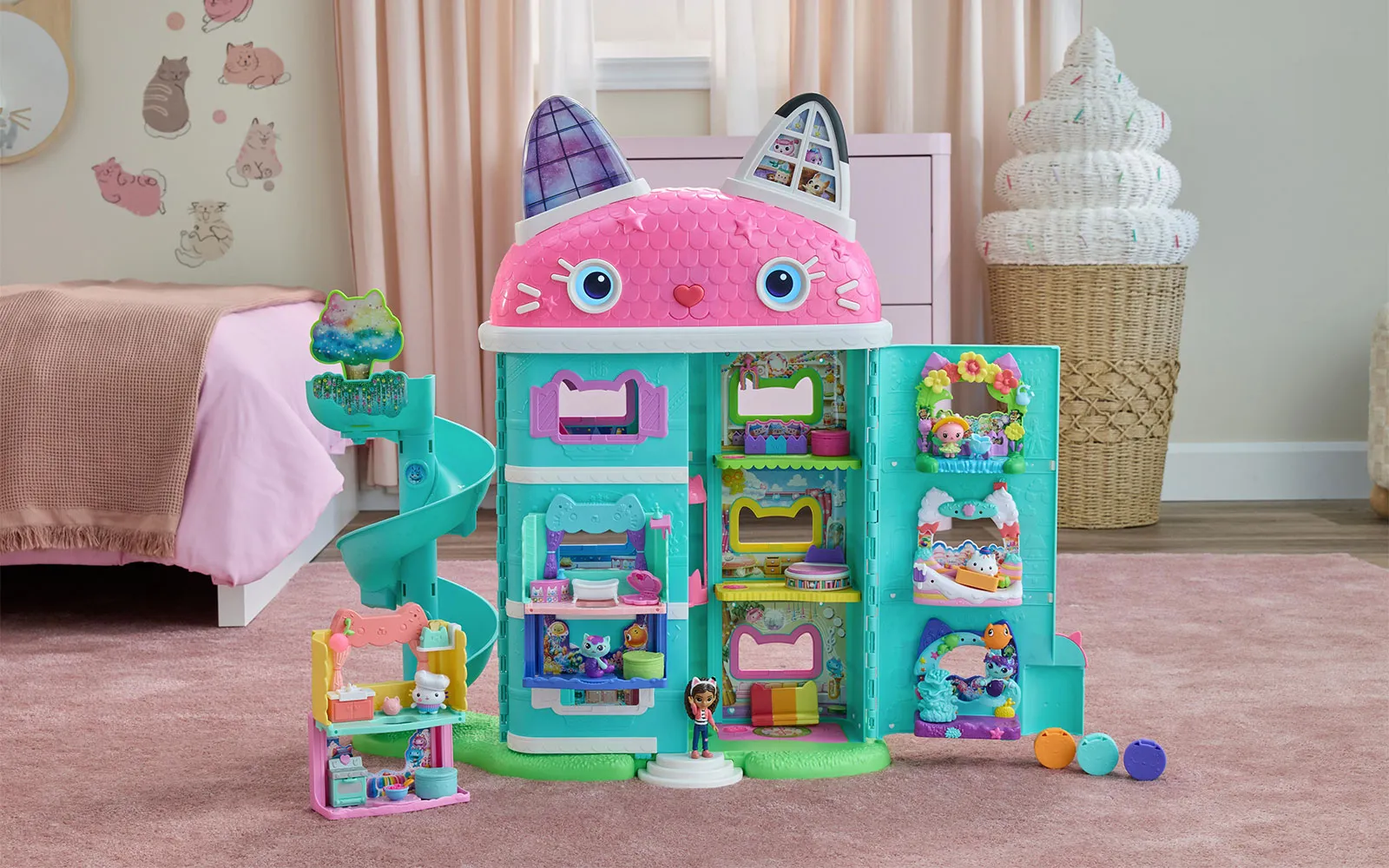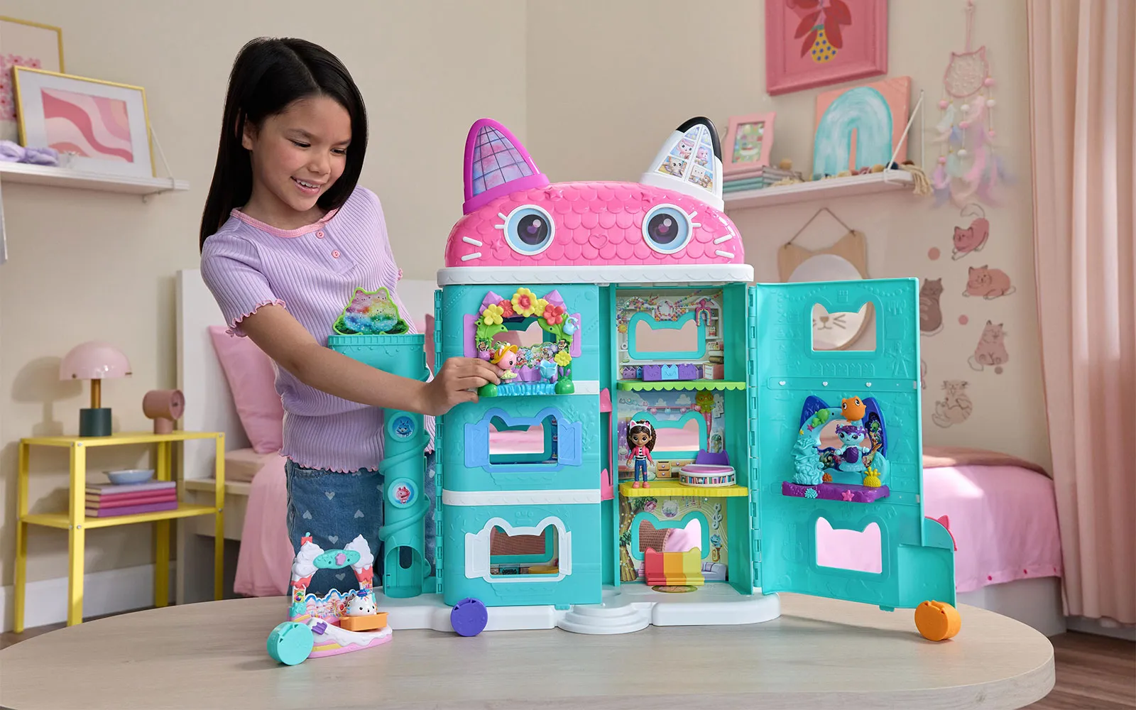 Vstopite v čudovit svet risanke Gabby’s dollhouse in odkrijte ljubke mačke in barvite čarovnije!Pridružite se mačji navdušenki Gabi in njeni pomočnici Pandošap v svetu zabavne igre!Tu so Gabi, Pandošap, Pandi, Vila mucka, Mucon, Škateljca, Tortek, Morska mucka, Avtjuša, Dremucka, Dj Mijav, Artur, Peter, Puhica Puhek, Flori, Škatolina, Bučko, Cukerc, Pekica, Kosmiček, Tortina, Papiga Pika, Cofka, Dj Komet, Lili-LU in Upsi, ki te čakajo, da se jim pridružiš na zabavnih dogodivščinah.Originalna imena likov v Gabby’s dollhouse so Gabby, Pandy Paws, Pandy, Kitty Fairy, Catrat, Baby Box, Cakey, MerCat, Carlita, Pillow Cat, Dj Catnip, Arthur, Pete, Fluffy Flufferton, Floyd, Mama Box, Pumpkin, Flakey, Bakey, Marshapan, PaddyCake, Parrot, Eggy, Dj Comet, Luli-Loo in Whoopsie.