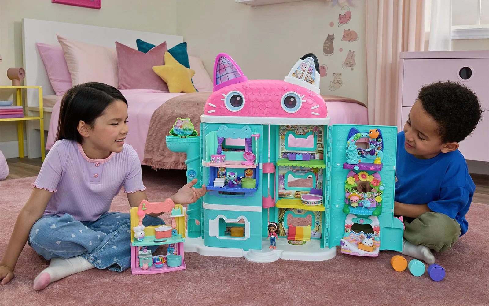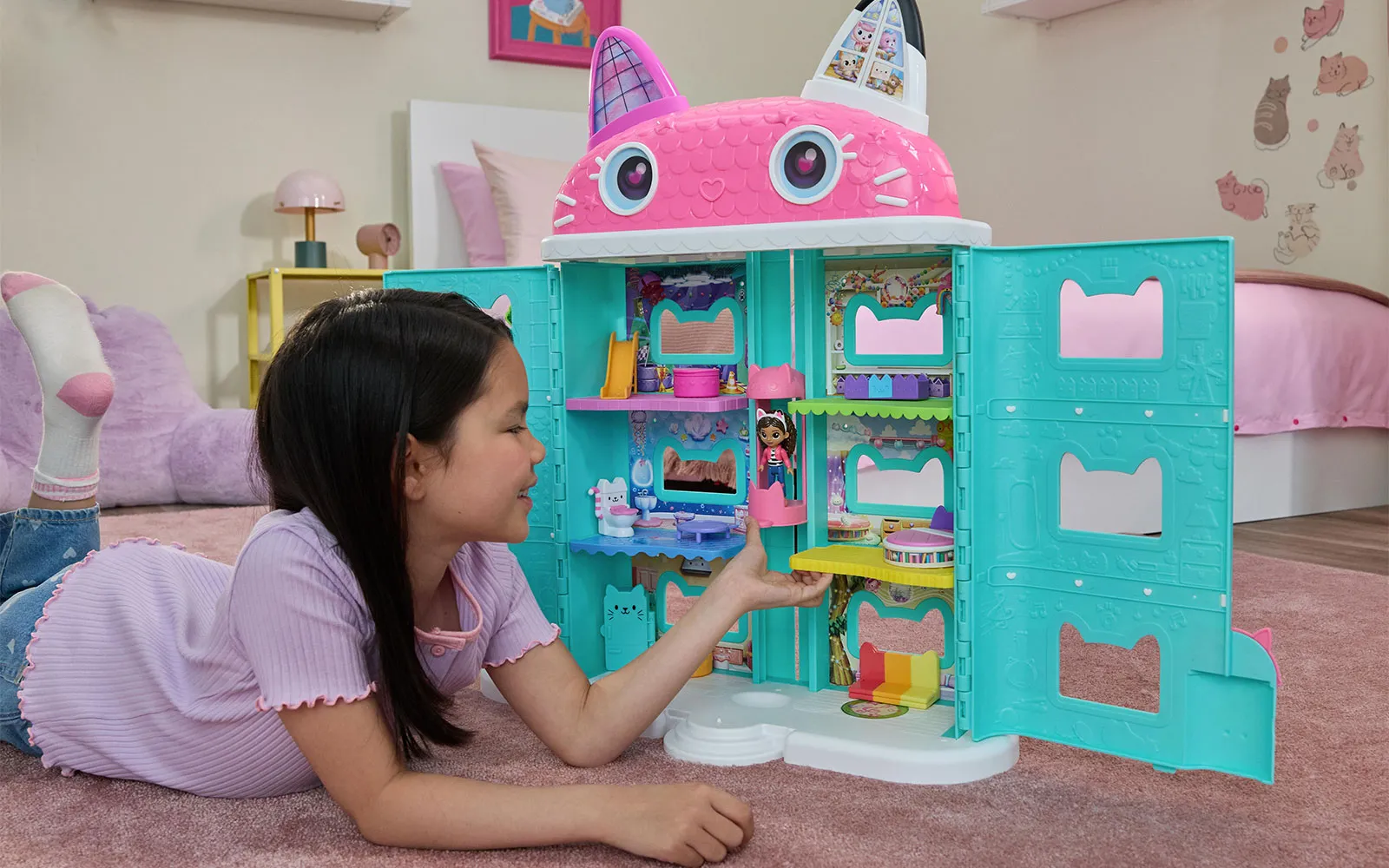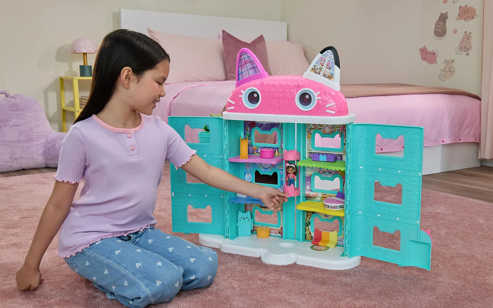 Vstopite v čudovit svet risanke Gabby’s dollhouse in odkrijte ljubke mačke in barvite čarovnije!Set vsebuje mačjetastično hišico.