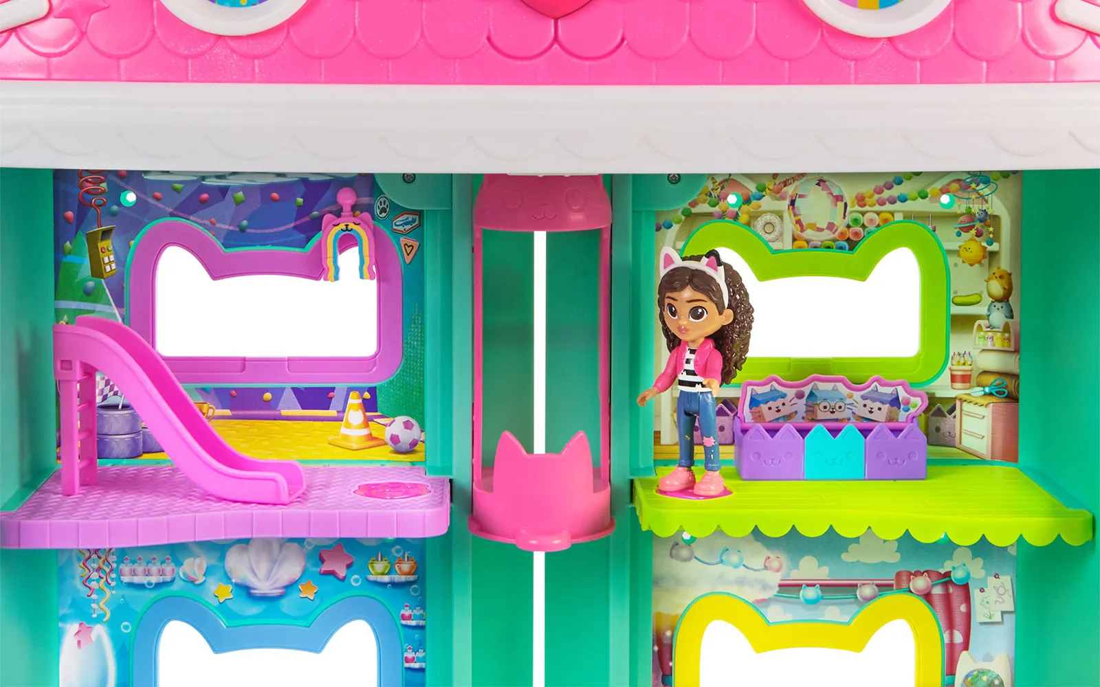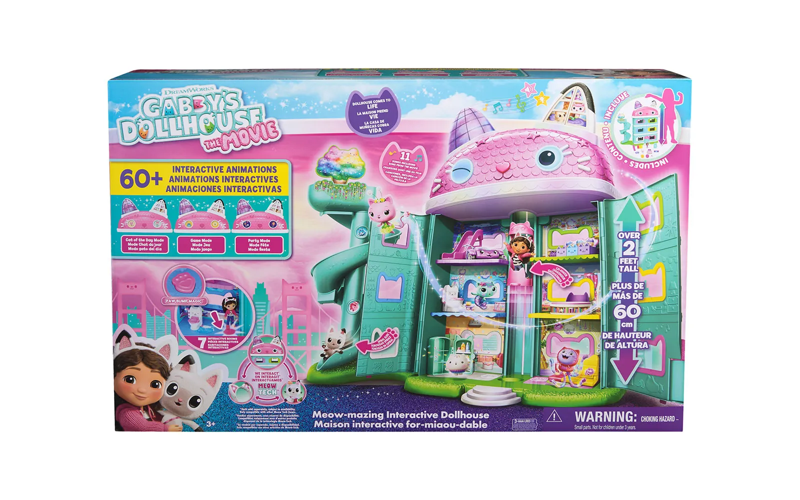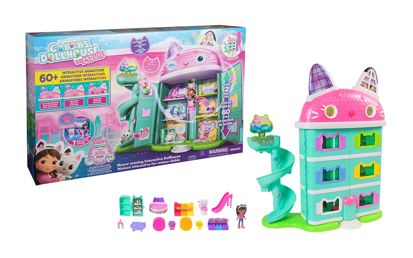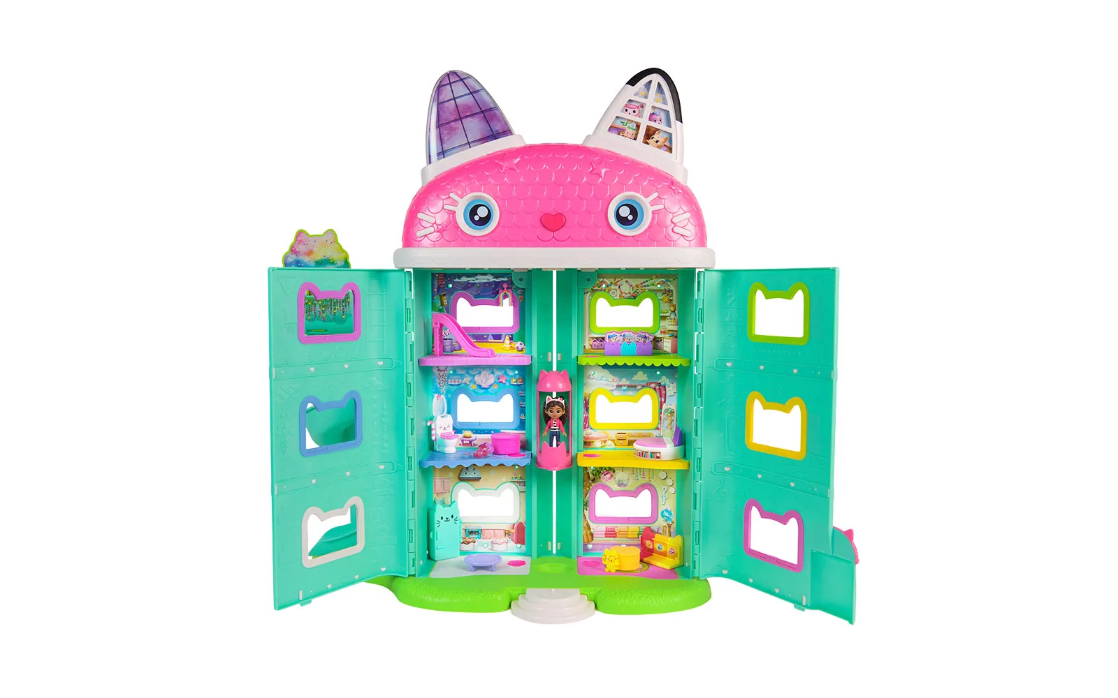 Doživite Gabbyjevo filmsko čarovnijo z mijavkajočo interaktivno hišico za punčke, visoko več kot 60 cm, ki vključuje 7 interaktivnih sob, animirane LCD-oči, delujoč Cat-a-vator in spiralni tobogan za dostavo, ob tem pa ponuja več kot interaktivnih 60 animacij, 3 načine igranja - igralni, zabavni ter Cat of the day način in dve zabavni igri, zvočne učinke in filmske animacije, ki se aktivirajo s čarobnimi gumbi, noski in premikanjem dvigala; tehnologija Meow omogoča povezavo z drugimi interaktivnimi dodatki, kot je naglavni obroč - magična ušesca in Pandyne šape (naprodaj ločeno), medtem ko s priloženimi figurami, pohištvom, dostavnimi škatlami in dodatki ustvarite lasten svet Gabbyjine domišljije, ki spodbuja ustvarjalno igro in ponuja nepozabno izkušnjo za vse male ljubitelje Gabbyjine hišice za punčke. Gabby punčka oživi, hkrati pa v hiški lahko poslušate tudi 11 različnih Gabby pesmic. Odkrij interakcijo med naglavnimi ušesci, hiško Gabby in plišasto figurico Pandy Paws - pritisni na tačko plišaste figurice Pandy Paws in oglasila se bo hiška ali pa ušesca. Pritisni na obe ušesci in oglasila se bo hiška ali figurica Pandy Paws. Pohiti, čaka te neskončna zabava!