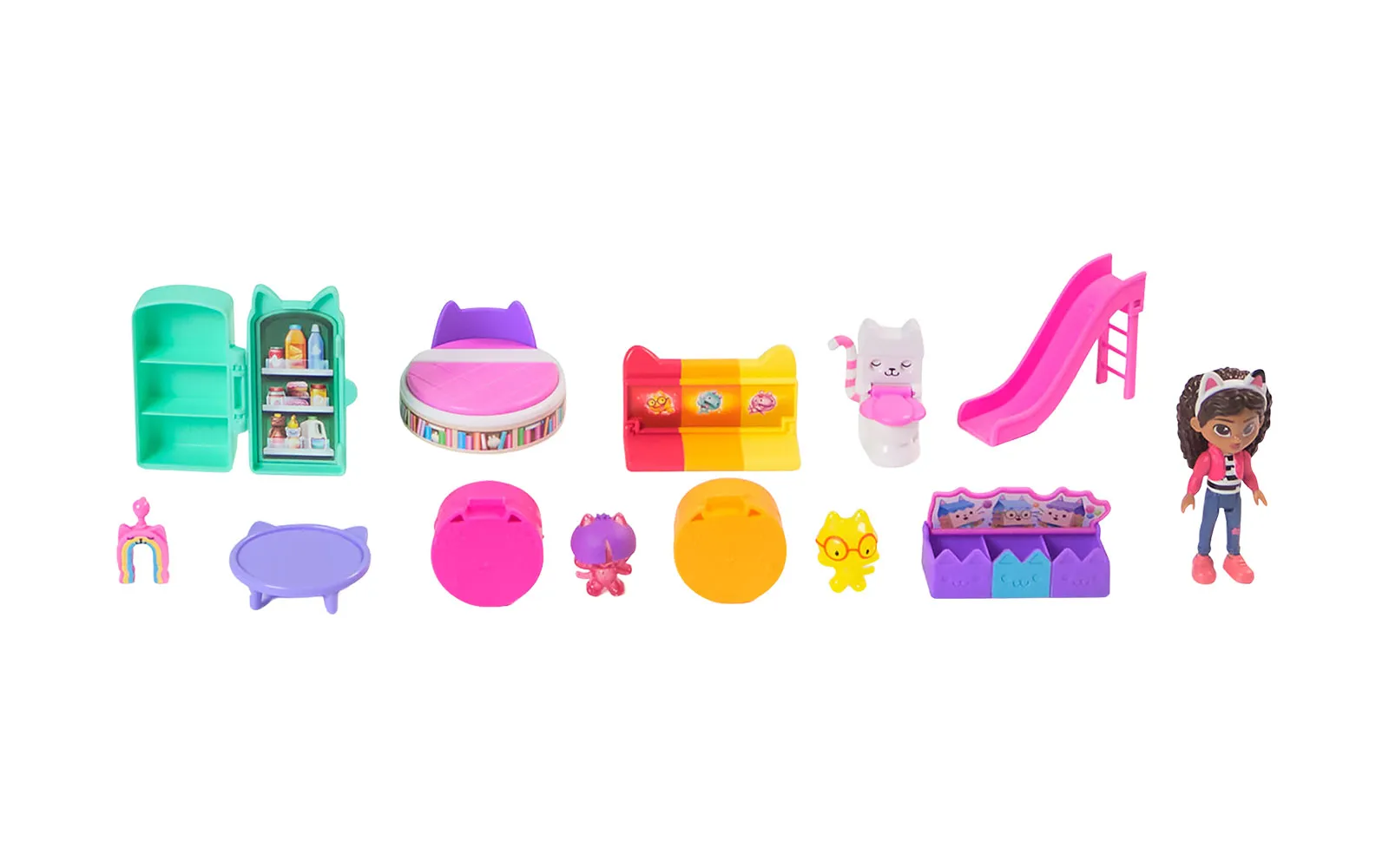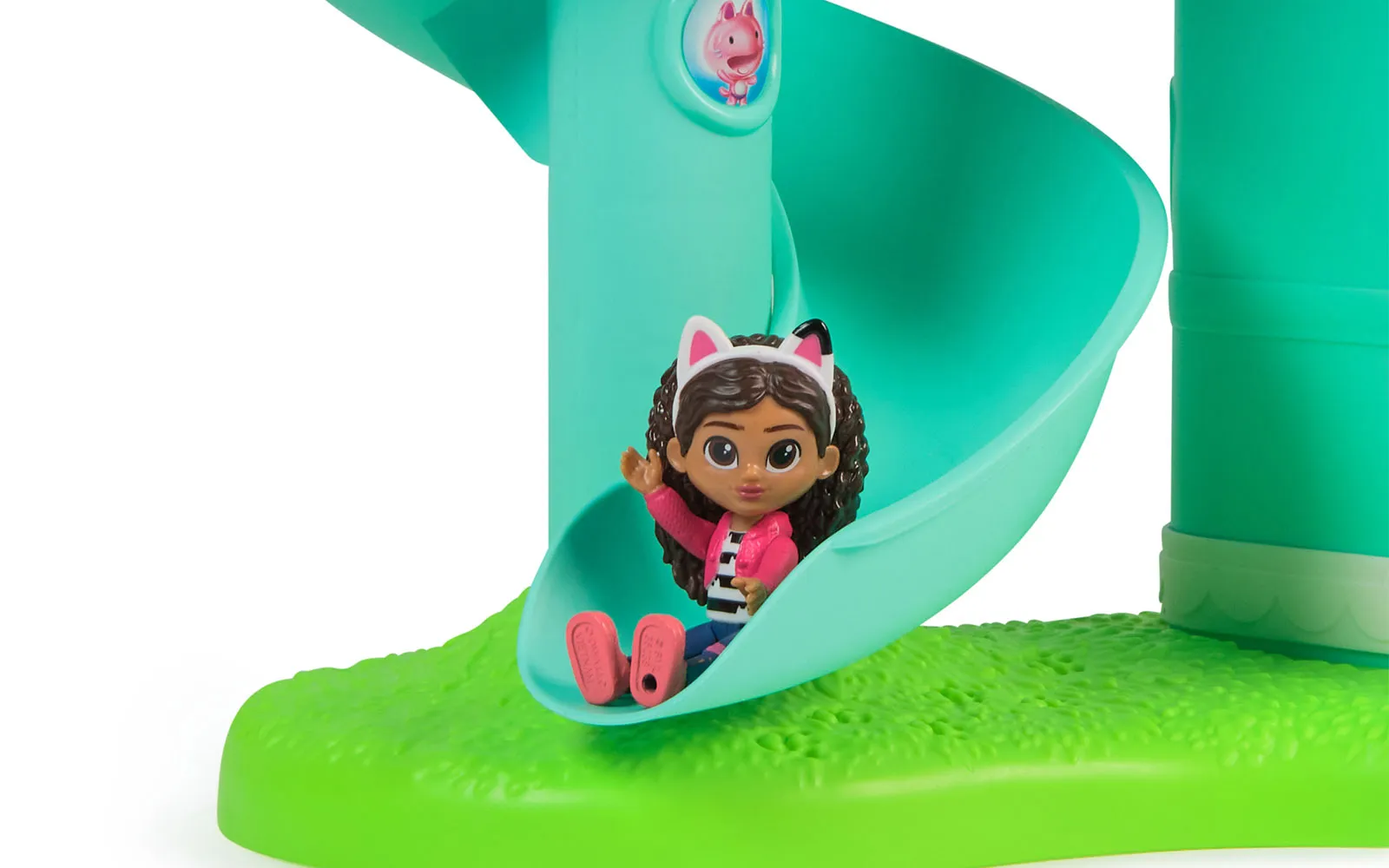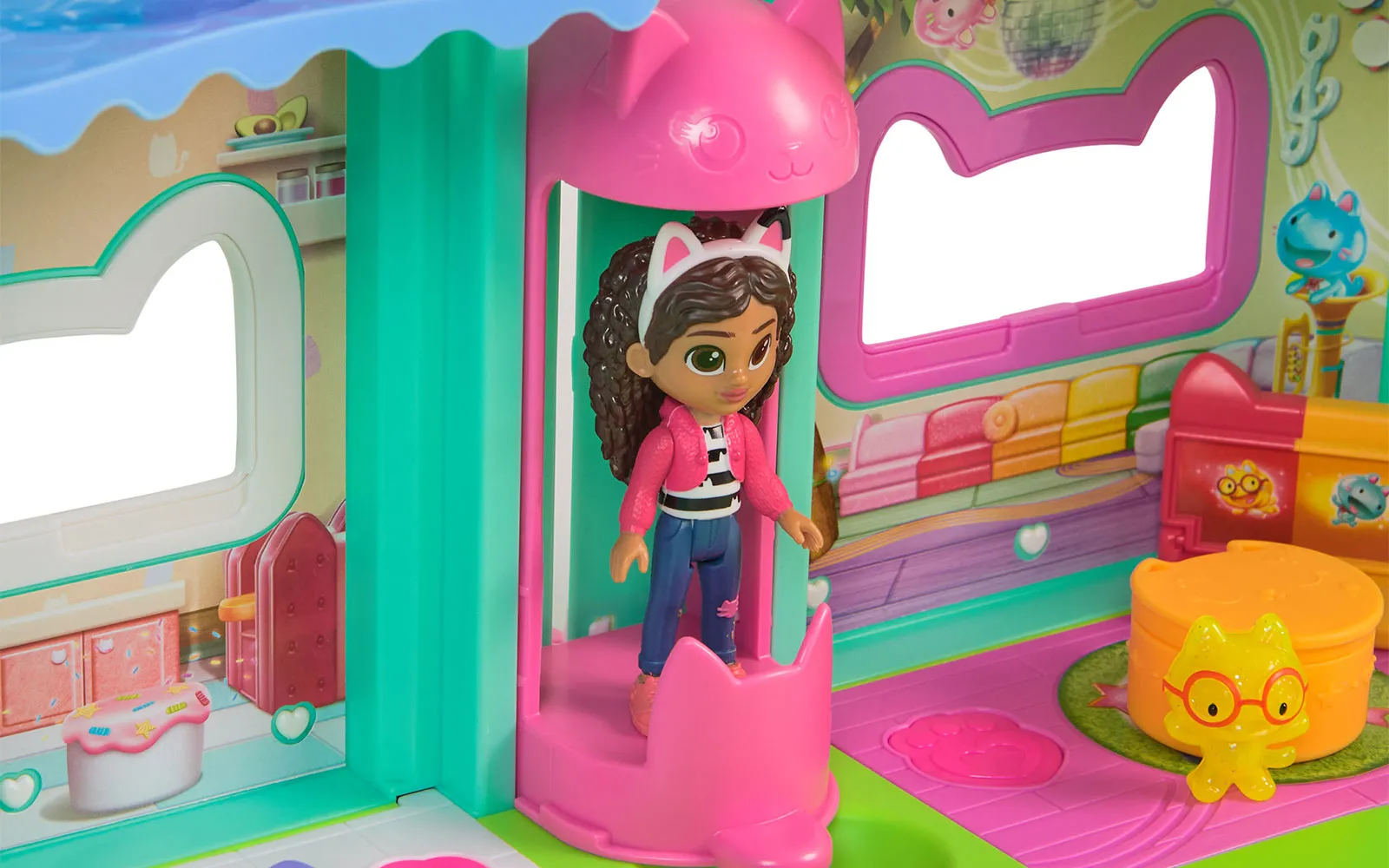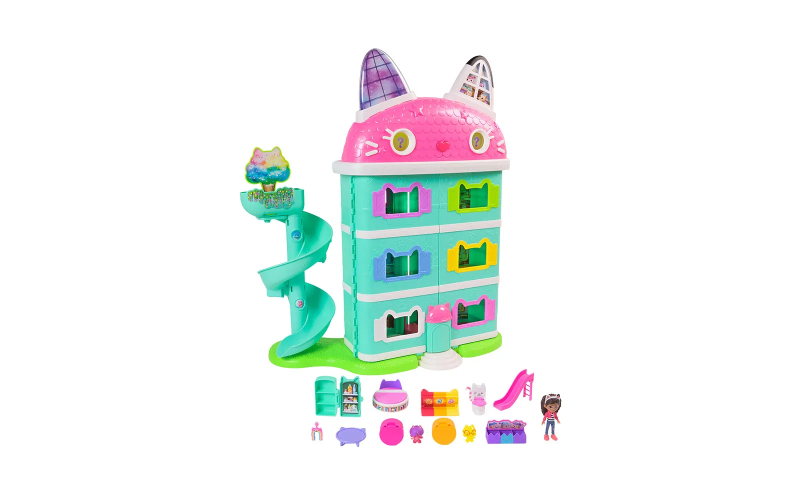 Doživite Gabbyjevo filmsko čarovnijo z mijavkajočo interaktivno hišico za punčke, visoko več kot 60 cm, ki vključuje 7 interaktivnih sob, animirane LCD-oči, delujoč Cat-a-vator in spiralni tobogan za dostavo, ob tem pa ponuja več kot interaktivnih 60 animacij, 3 načine igranja - igralni, zabavni ter Cat of the day način in dve zabavni igri, zvočne učinke in filmske animacije, ki se aktivirajo s čarobnimi gumbi, noski in premikanjem dvigala; tehnologija Meow omogoča povezavo z drugimi interaktivnimi dodatki, kot je naglavni obroč - magična ušesca in Pandyne šape (naprodaj ločeno), medtem ko s priloženimi figurami, pohištvom, dostavnimi škatlami in dodatki ustvarite lasten svet Gabbyjine domišljije, ki spodbuja ustvarjalno igro in ponuja nepozabno izkušnjo za vse male ljubitelje Gabbyjine hišice za punčke. Gabby punčka oživi, hkrati pa v hiški lahko poslušate tudi 11 različnih Gabby pesmic. Odkrij interakcijo med naglavnimi ušesci, hiško Gabby in plišasto figurico Pandy Paws - pritisni na tačko plišaste figurice Pandy Paws in oglasila se bo hiška ali pa ušesca. Pritisni na obe ušesci in oglasila se bo hiška ali figurica Pandy Paws. Pohiti, čaka te neskončna zabava!