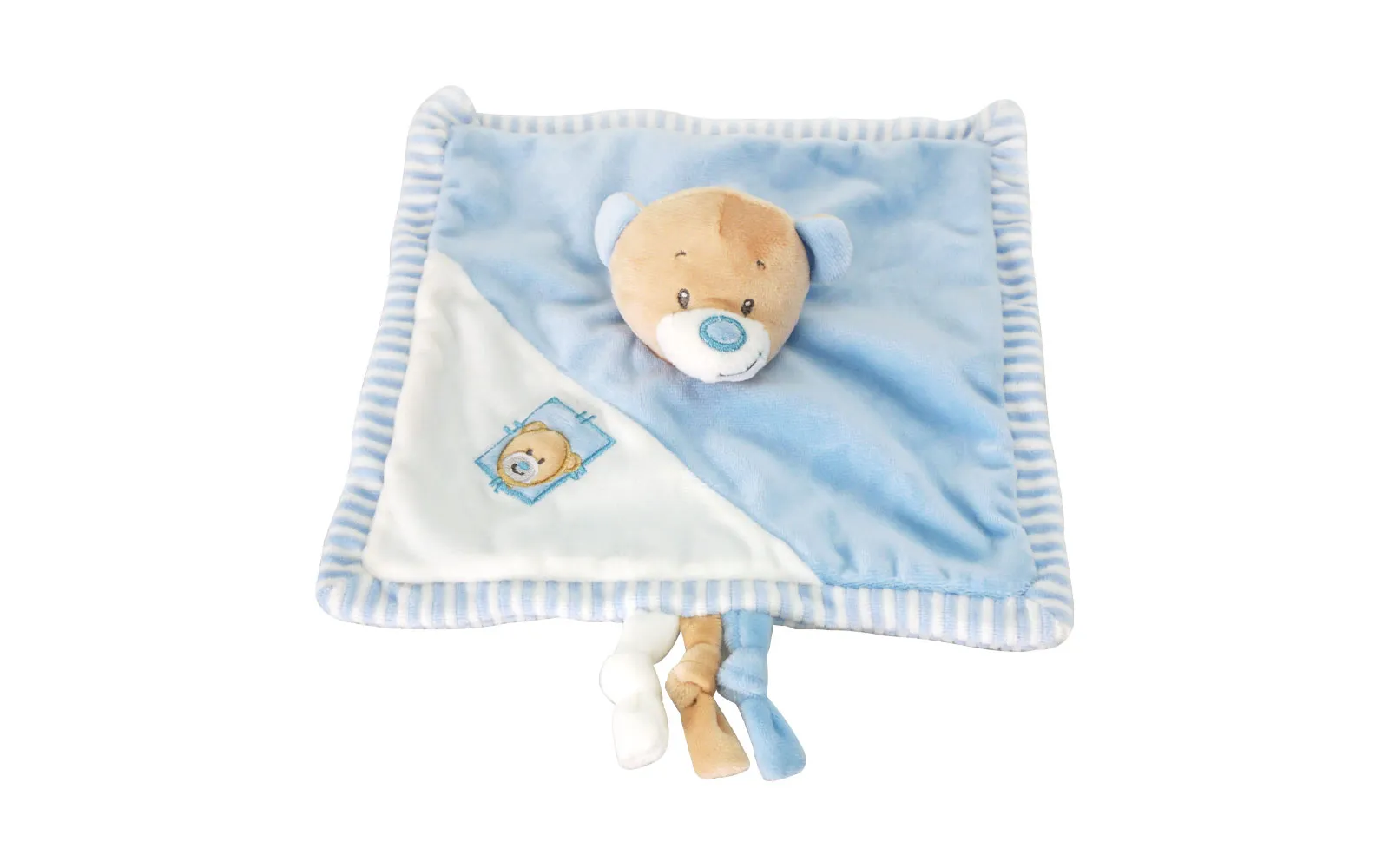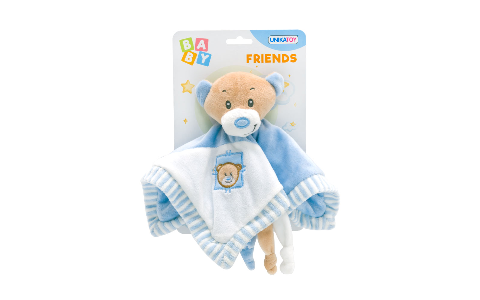 Plišasta medo-odejica modre ali roza barve velikosti 26x26 cm z vdolbinico v plišasti glavici, v katero vstavite prst in plišasta odejica se spremeni v ročno lutko.