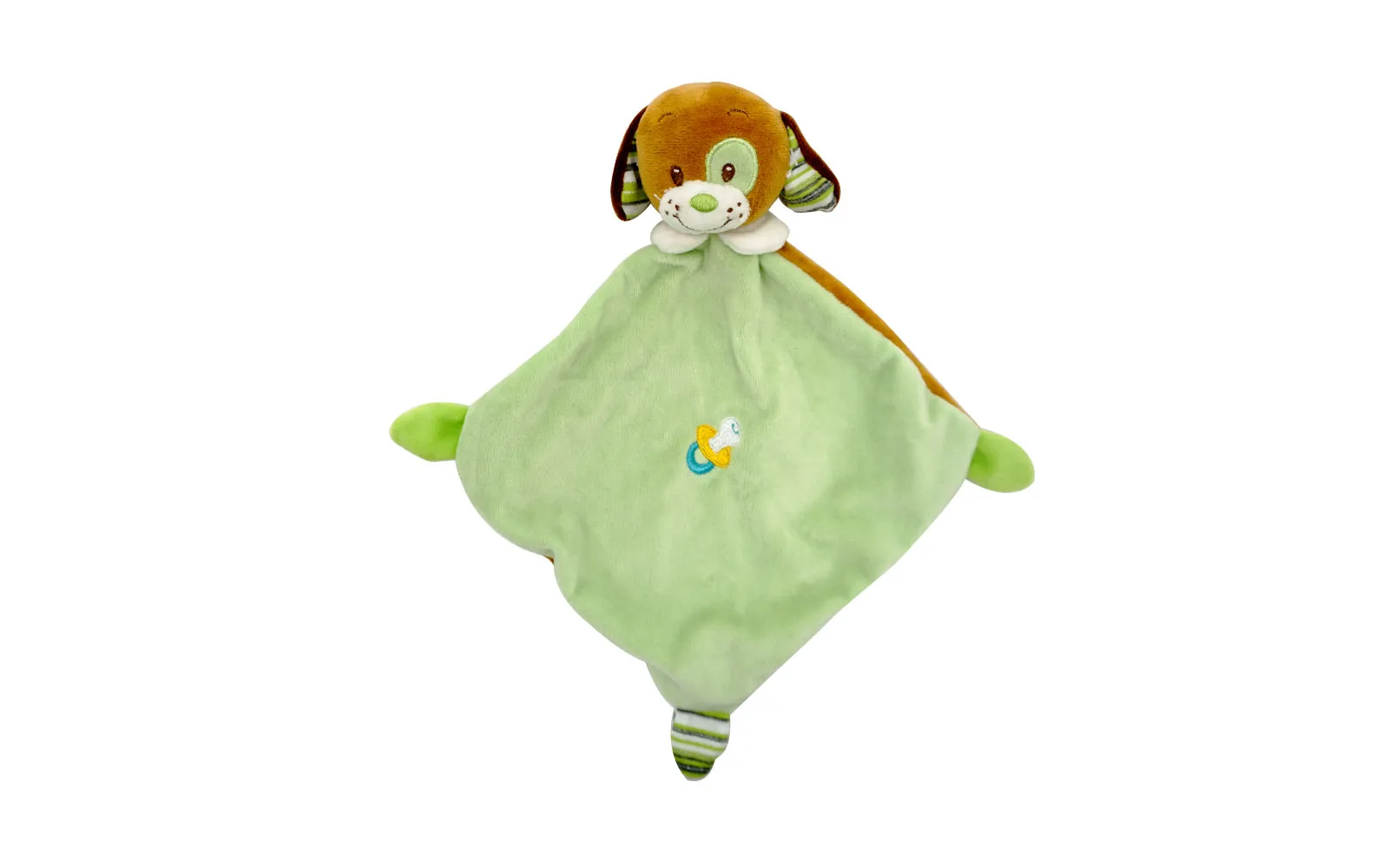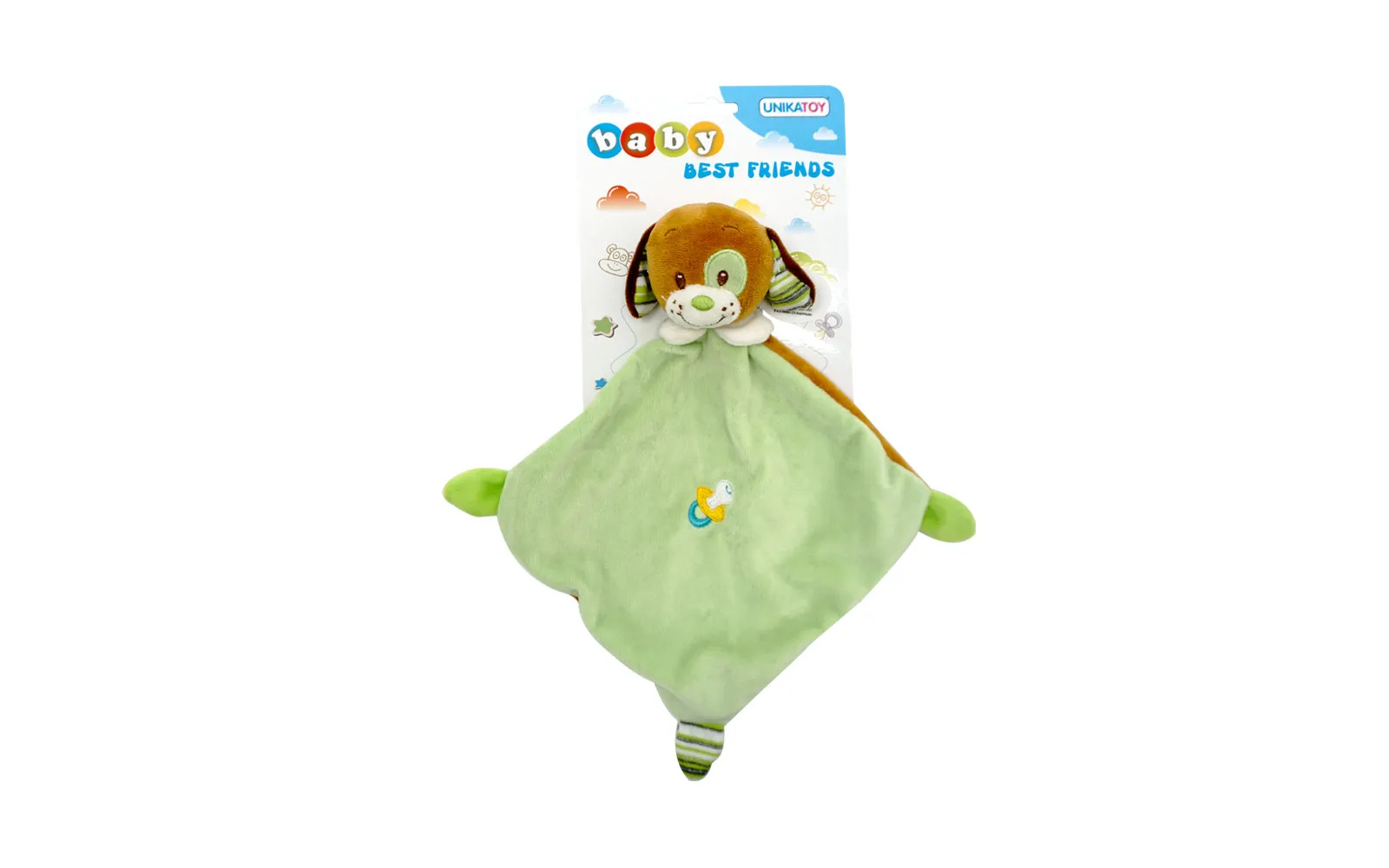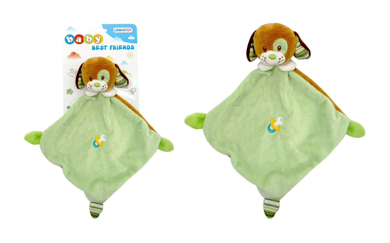 Plišasta baby živalica-ninica blagovne znamke Unikatoy v zeleni barvi je velikosti 30 centimetrov. Ninica je na otip mehka in primerna za najmlajše. Na voljo kot kužek, medvedek ali zajček.