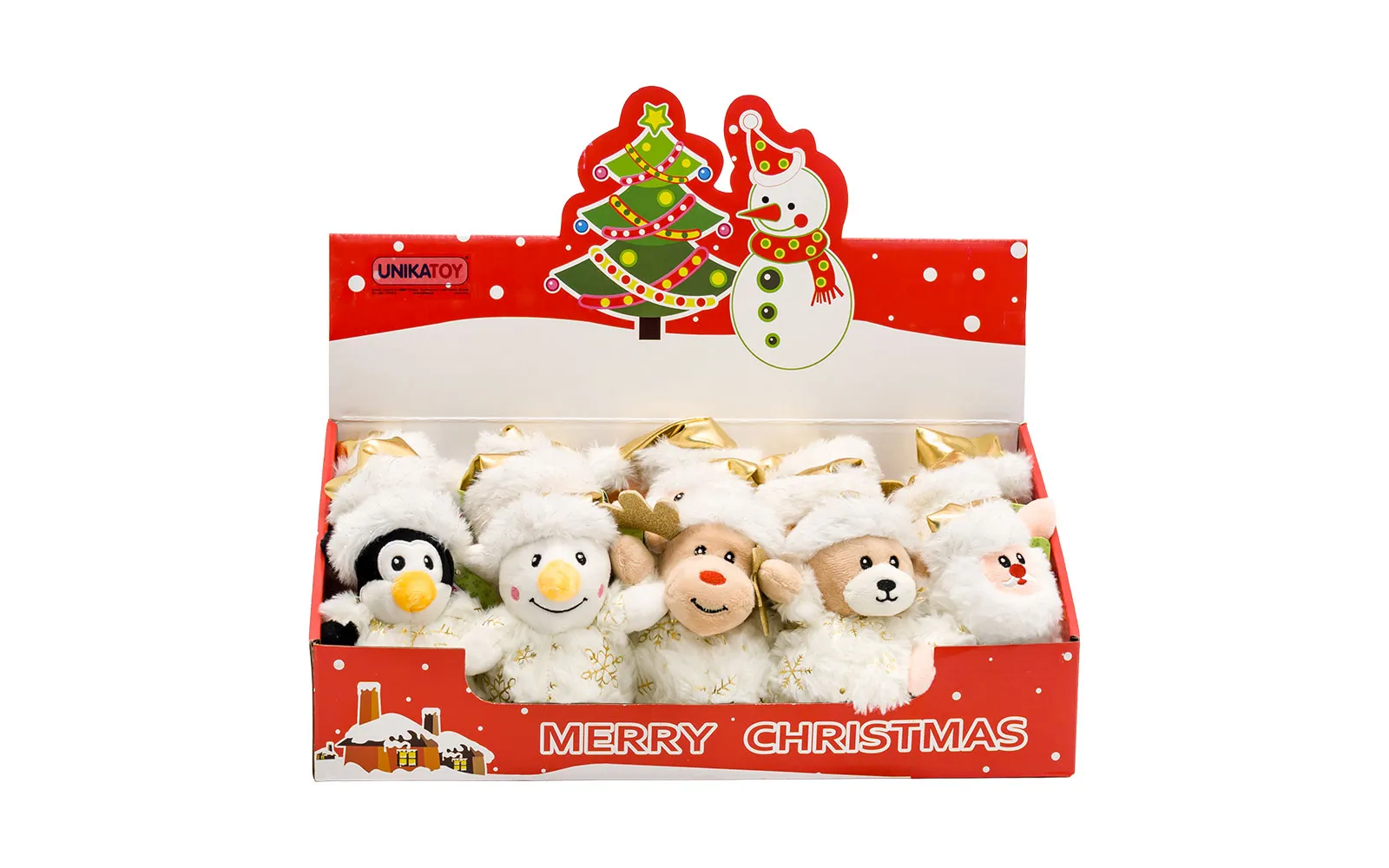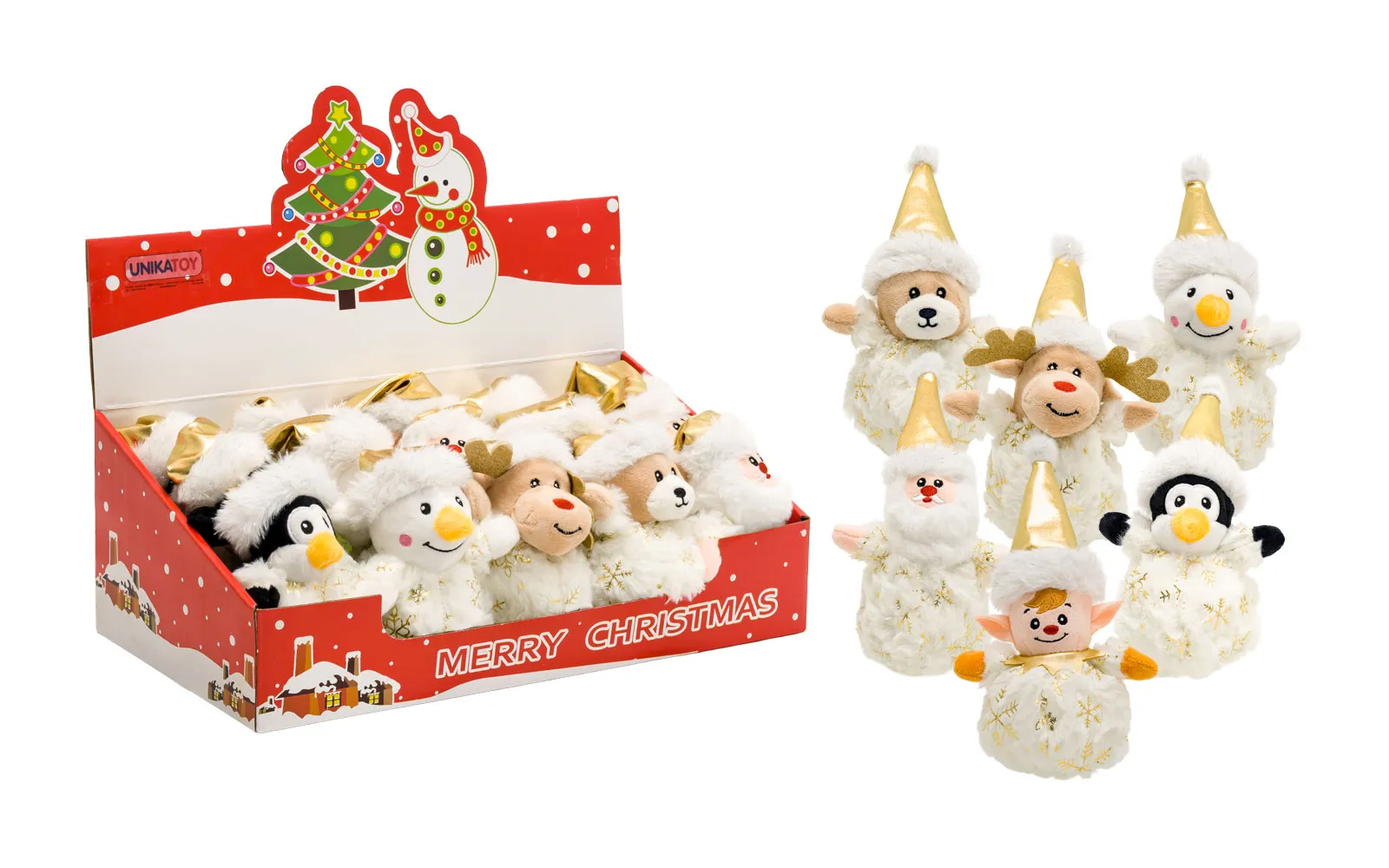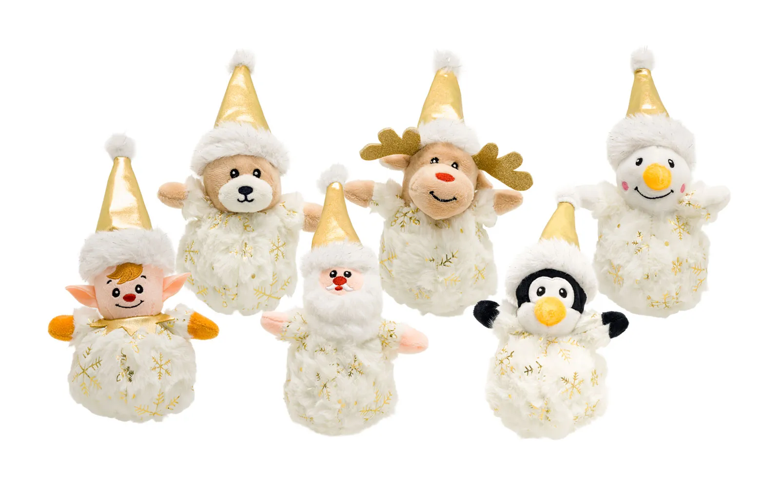 Plišaste božične figure so velikosti 12 centimetrov in bele barve. Imajo tople kape in čudovite zlate detajle, ki jim dajejo praznični sijaj. Na otip so izjemno mehke, zato bodo popolni spremljevalci za zimske dni in čudovita okrasitev vašega doma! Na voljo v različnih stilih - medvedek, jelenček, snežak, Božiček, pingvin in škratek.