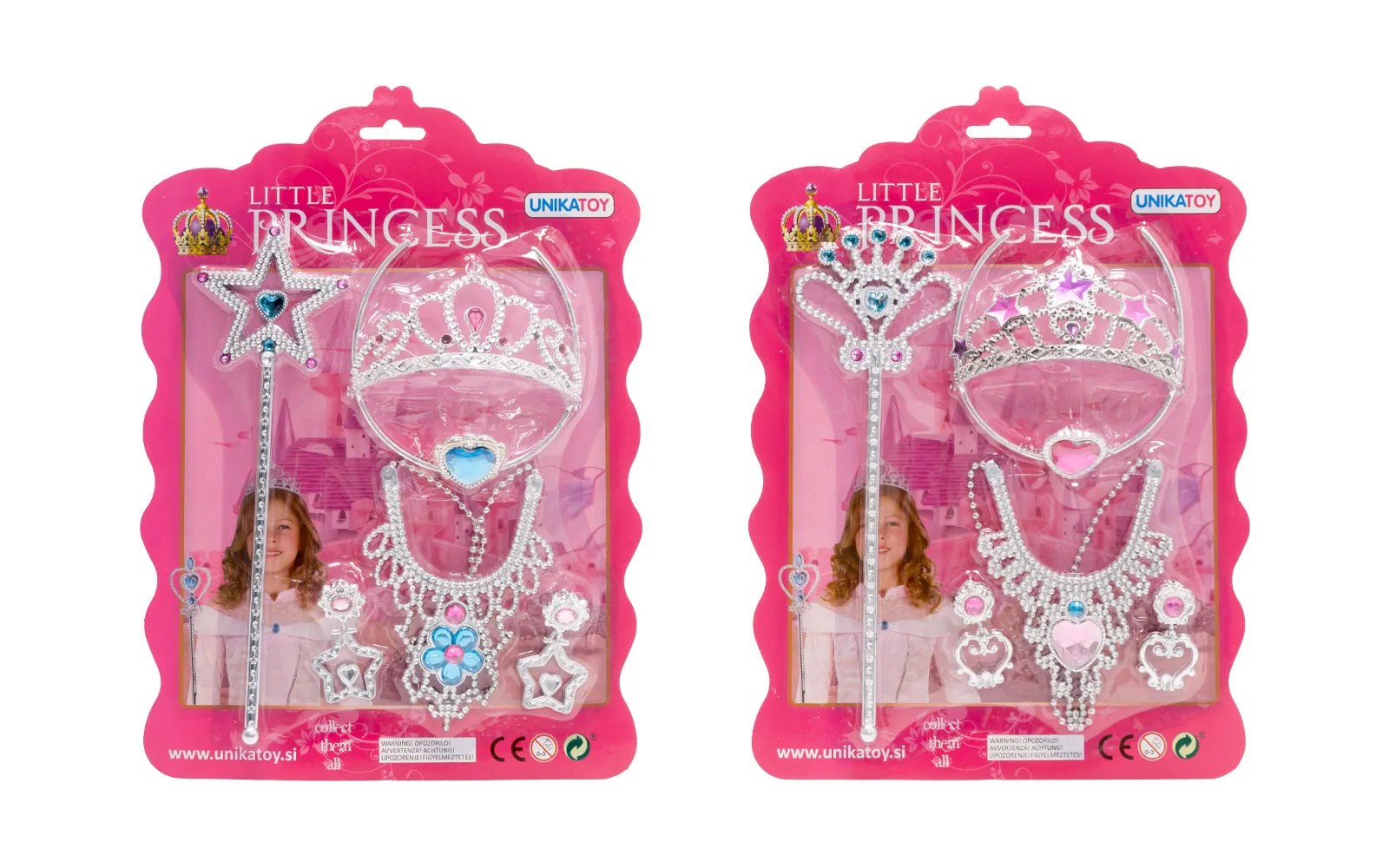 Princeskina zabava naj se prične s setom nakita dveh različnih stilov, ki vsebuje palico, kronco, ogrlico in uhane.