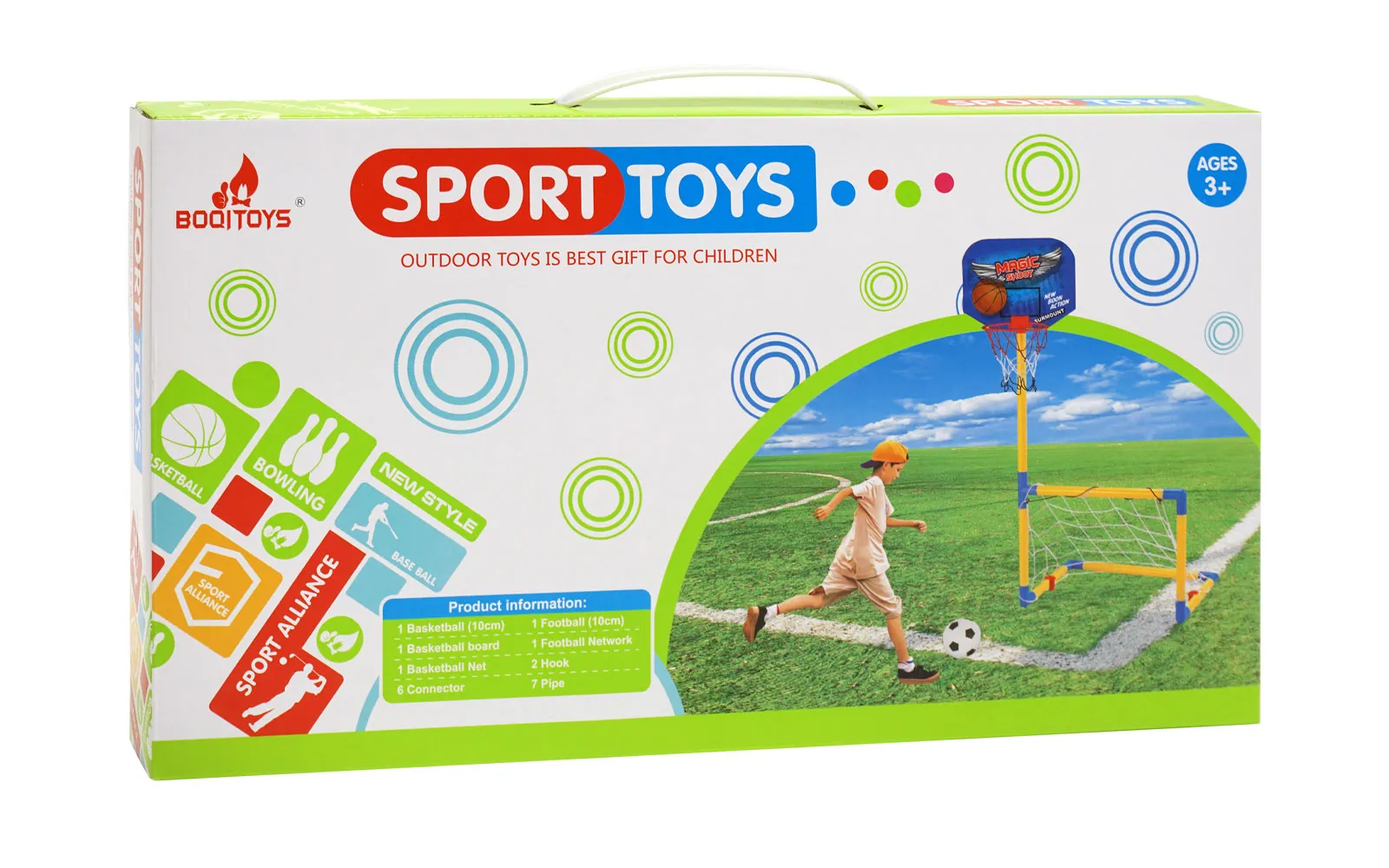Set vsebuje 1 žogo za košarko fi 10 cm, 1 žogo za nogomet fi 10 cm, tlačilko ter gol skupaj s košem dimenzije 48x97x34 cm. Vrzi žogo na koš ali brcni žogo v gol. Odločitev je tvoja. Gol-koš lahko postaviš v stanovanje, če pa uporabiš priložena klina, se lahko zabavaš tudi na travi. Palice gola in spojke so iz PVC materiala.