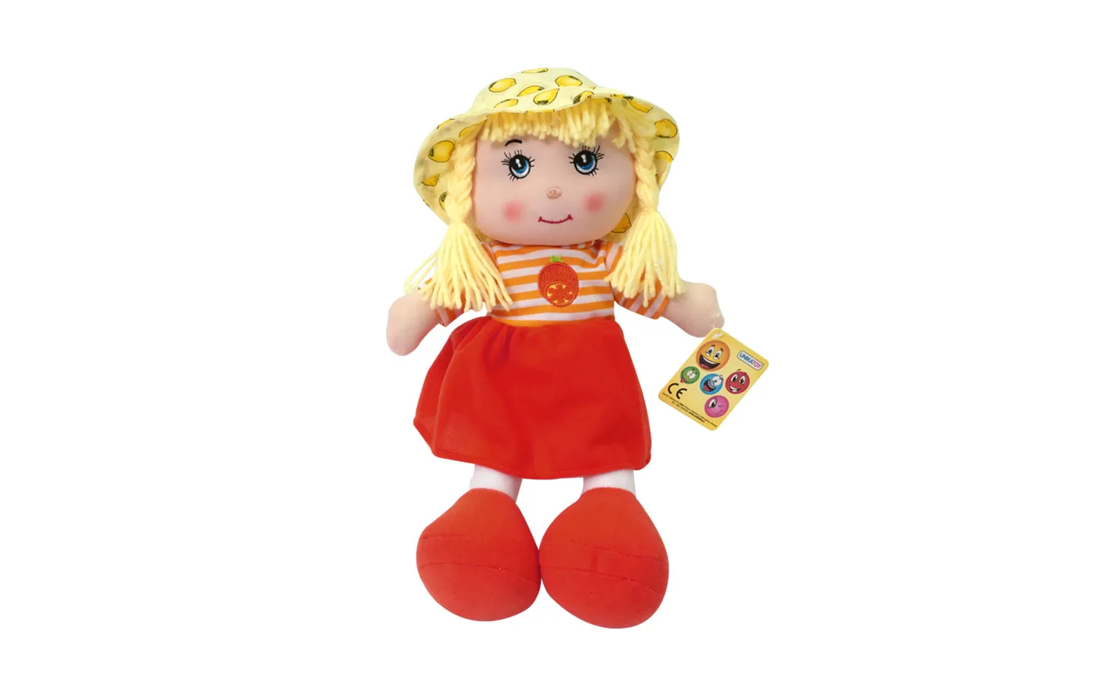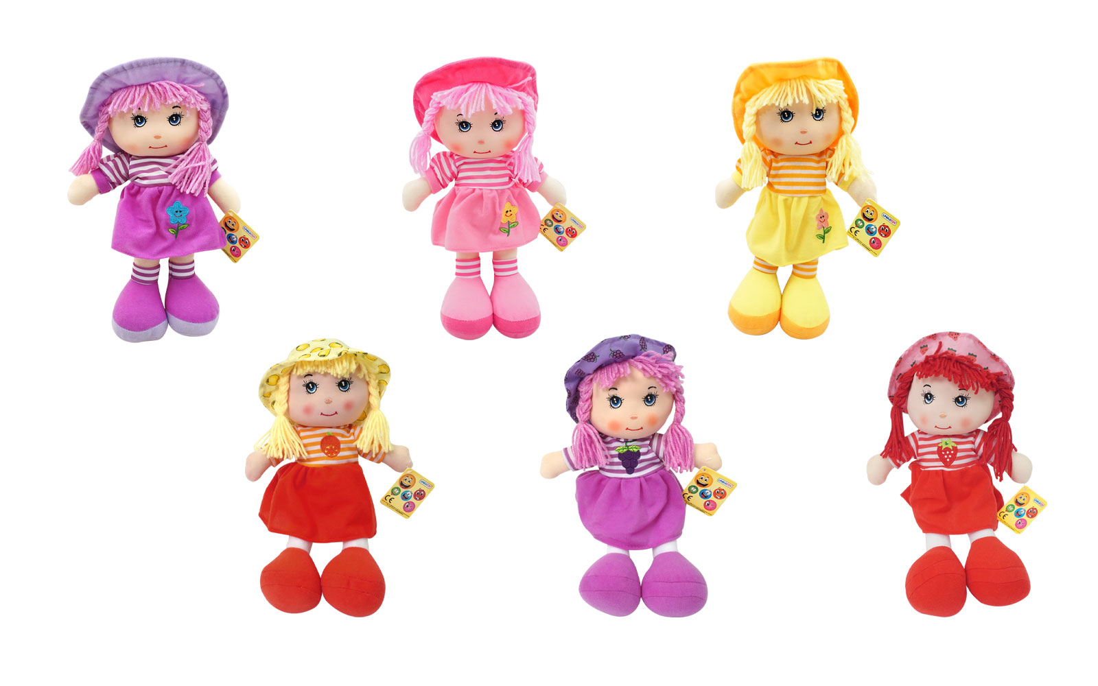 Punčka iz blaga s klobučkom in kitkama velikosti 36 cm različnih barvnih kombinacij. Punčke dveh različnih stilov - z rožico na krilu ali sadjem na majčki.