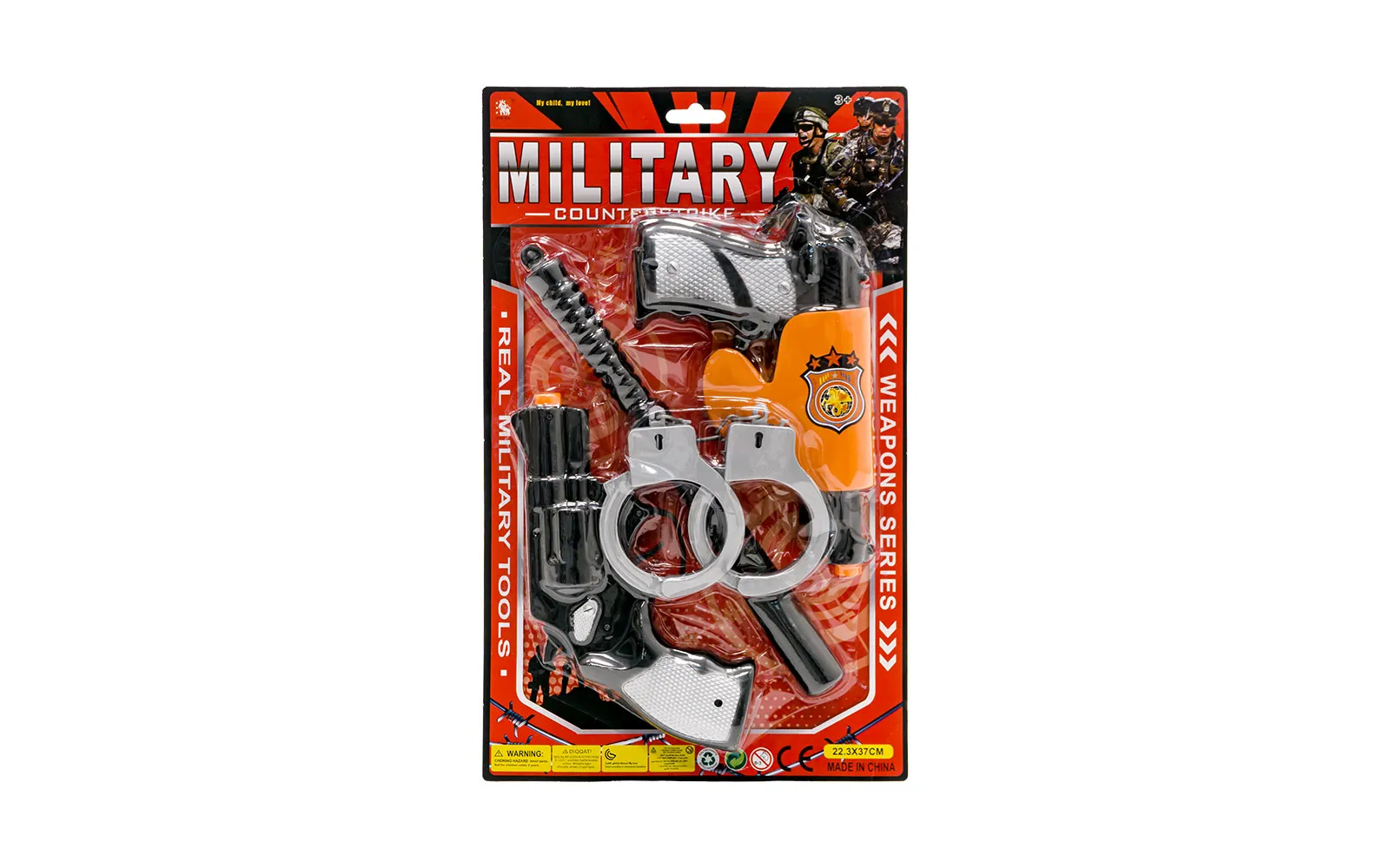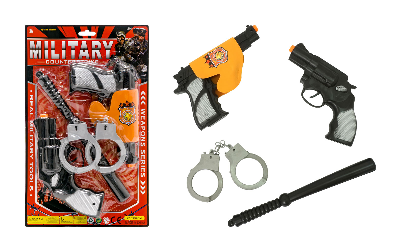 Set različnih policijskih pripomočkov med katerimi sta dve pištoli, lisice, pendrek in še kaj.