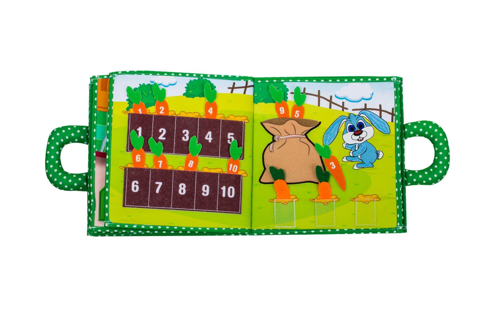 Ročno izdelana interaktivna tekstilna knjigica Piqipi-Zajček je tako imenovana tiha knjiga, s katero se otroci igrajo, ob tem pa se še veliko naučijo. Vsaka stran v knjigi ima unikatno igro v kateri se otrok uči številk, barv, oblik in še veliko več.